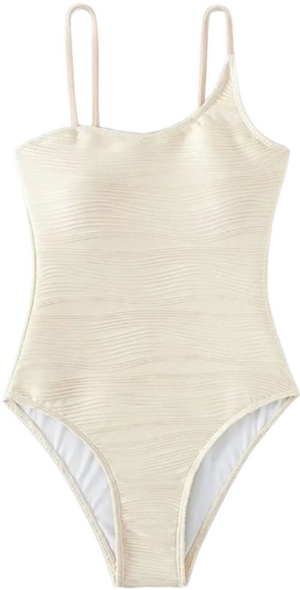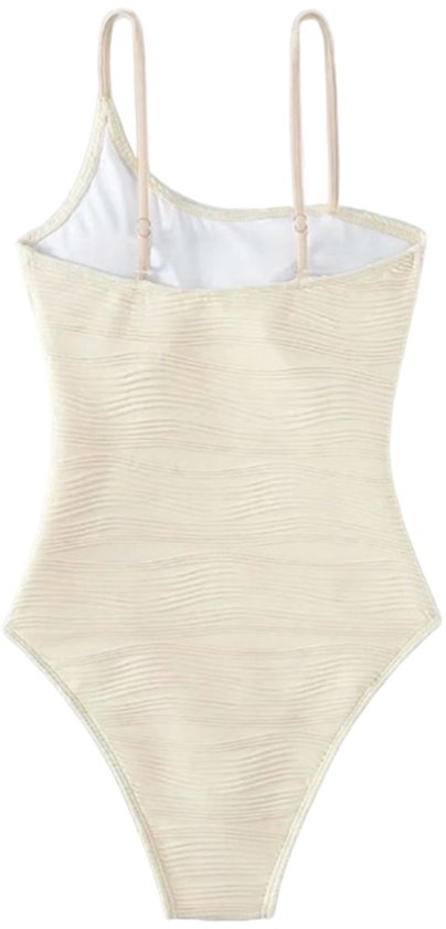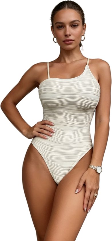 Dit elegante crème badpak biedt een verfijnde uitstraling door zijn asymmetrische schouderband en de subtiele golvende textuur van de stof. Het ontwerp is zowel stijlvol als flatterend, met een hoge beenuitsnijding die de benen optisch verlengt. Het badpak is gemaakt van soepel stretchmateriaal dat zich mooi naar het lichaam vormt voor een comfortabele pasvorm. De zachte en ademende stof biedt zowel ondersteuning als bewegingsvrijheid, ideaal voor zowel ontspanning als actief gebruik in het water. Dit badpak is perfect voor wie op zoek is naar een moderne en chique look, zowel voor een zonnesessie op het strand als voor een verfrissende duik in het zwembad. Het strakke en minimalistische ontwerp maakt het een tijdloze keuze voor elke gelegenheid.