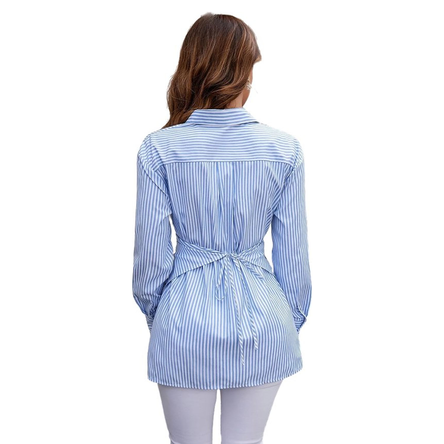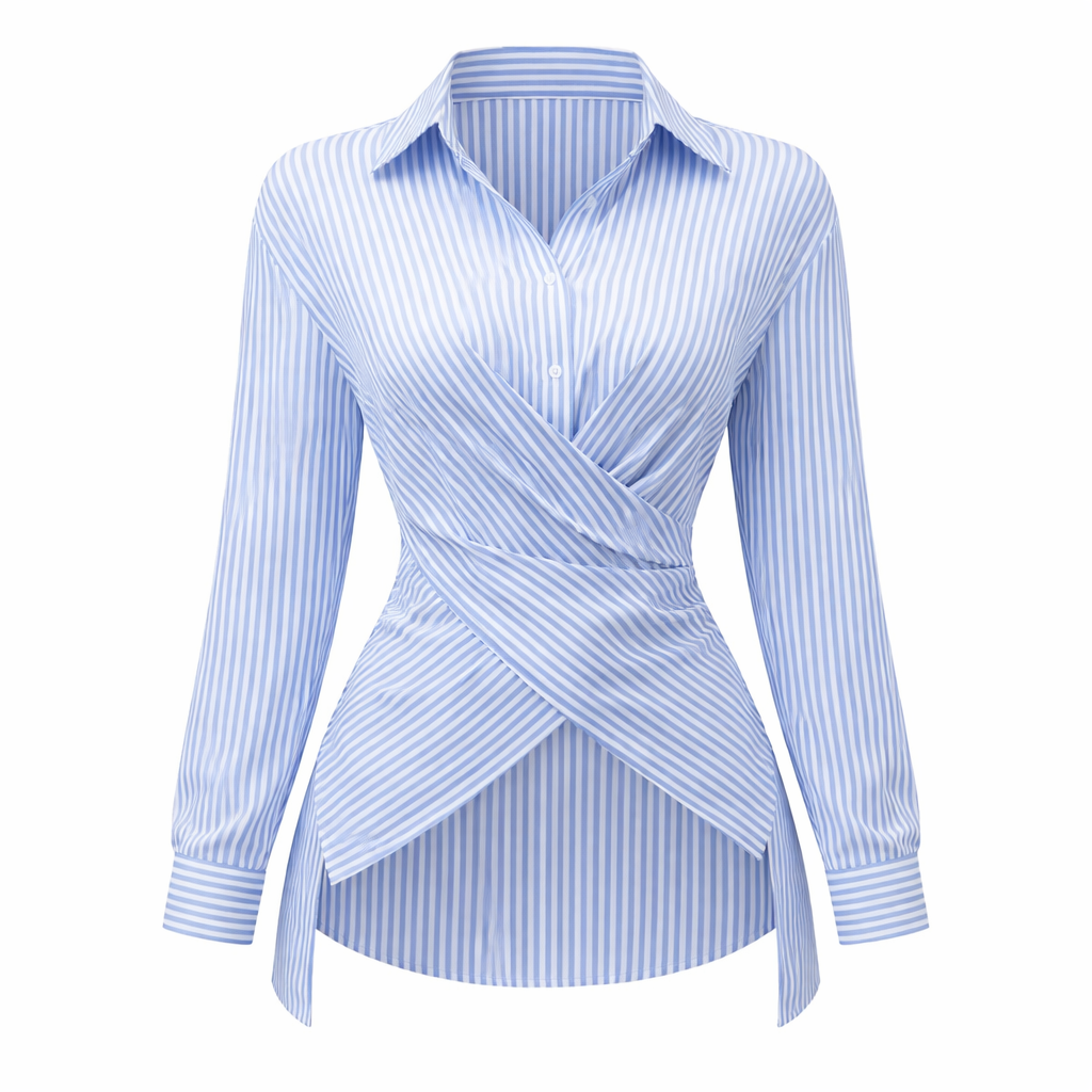 Deze elegante blouse is gemaakt van een hoogwaardige stof die zacht aanvoelt en mooi valt. De lichtblauw-witte verticale strepen zorgen voor een frisse en tijdloze uitstraling. De voorkant heeft een verfijnde overslag die het silhouet mooi accentueert. Aan de achterkant zorgt een subtiel strikdetail voor een elegante taille. De blouse is ideaal te combineren met zowel jeans als een nette broek. Perfect voor een verzorgde look op kantoor of een stijlvolle dag in de stad.