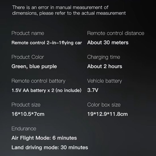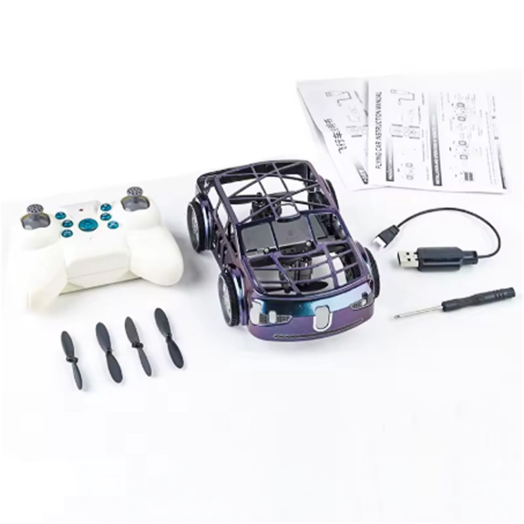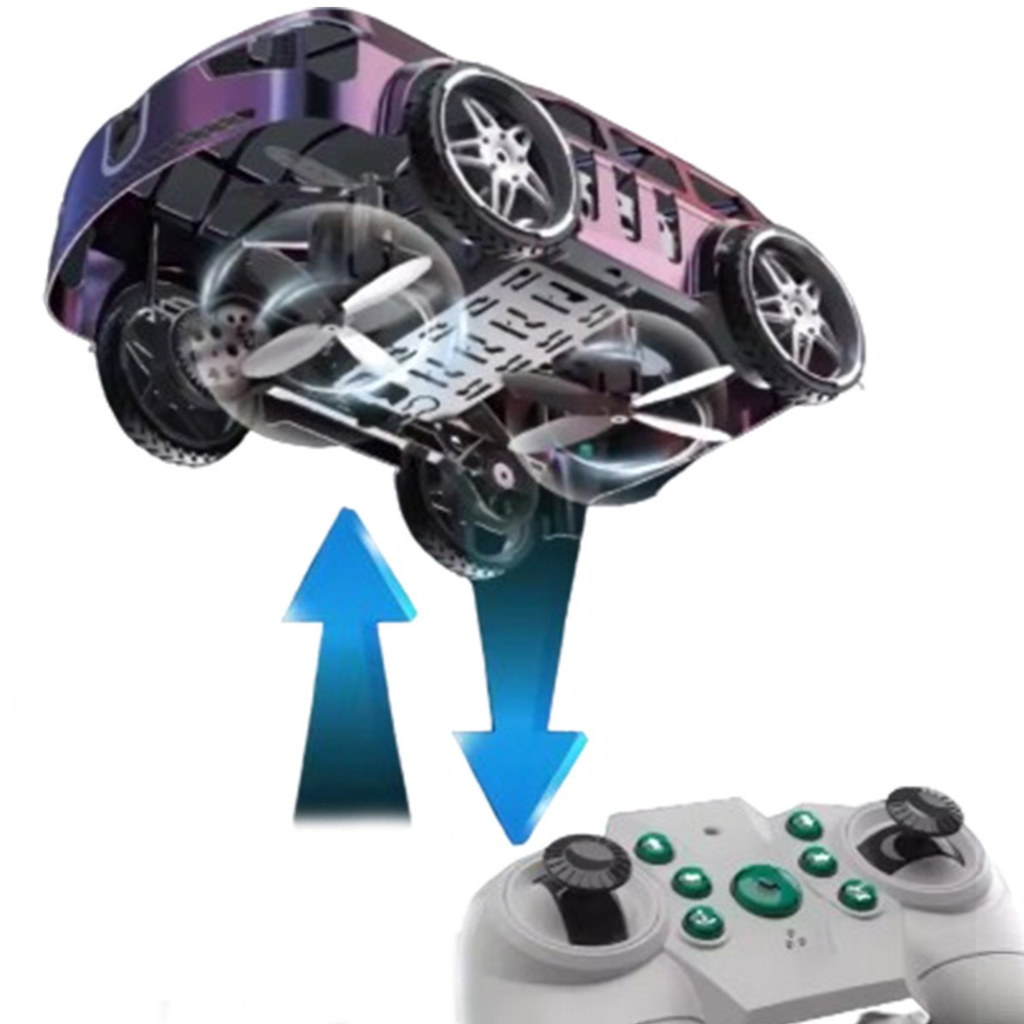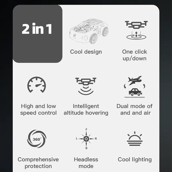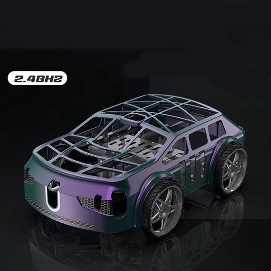 Deze 2-in-1 RC-auto en drone combineert rijden en vliegen in één uniek ontwerp. Op de grond functioneert hij als een snelle, wendbare auto, terwijl de ingebouwde propellers het voertuig moeiteloos laten opstijgen. Dankzij altitude hold blijft hij stabiel in de lucht en met headless mode is besturen extra eenvoudig. De kooi-constructie beschermt de propellers bij botsingen, ideaal voor kinderen. Je schakelt met één knop tussen land- en luchtmodus. Voorzien van twee snelheden, 2.4GHz-besturing tot ongeveer 30 meter en kleurrijke verlichting. Opladen duurt circa 2 uur, waarna je tot 6 minuten kunt vliegen of 30 minuten kunt rijden. Een leuk en innovatief speelgoedvoertuig voor jong en oud.