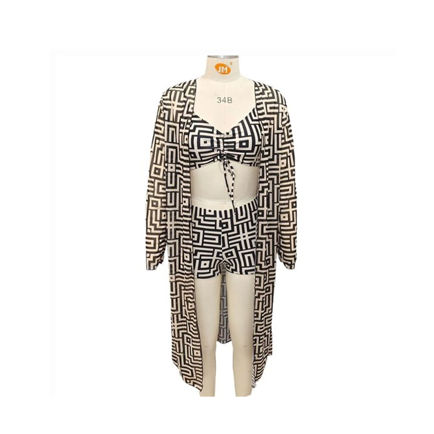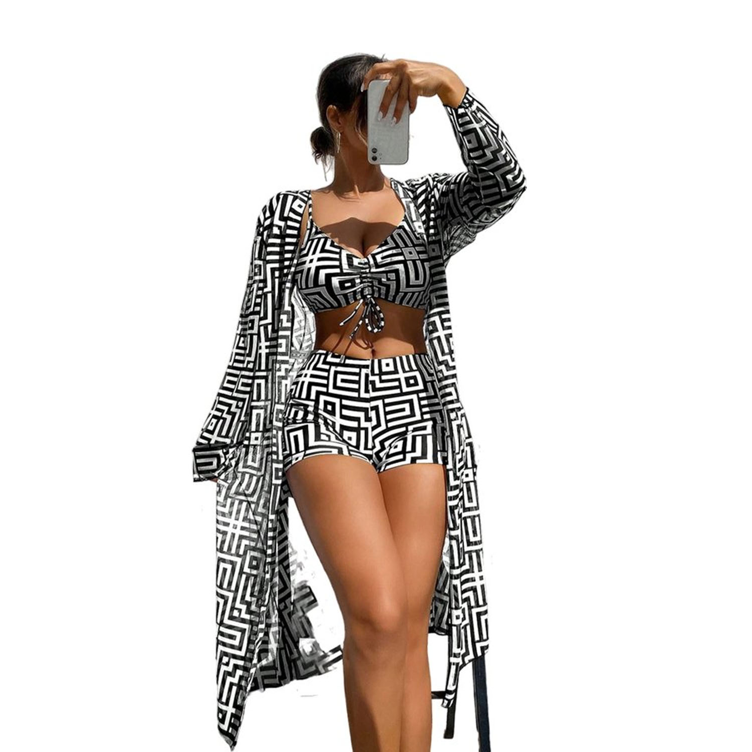Deze stijlvolle 3-delige badkledingset is ontworpen voor vrouwen die mode en comfort willen combineren. De set bevat een sportieve tankinitop met verstelbare vetersluiting, een high-waist short en een lange cover-up in dezelfde opvallende zwart-witte print. De geometrische patronen geven de outfit een moderne, energieke uitstraling. Dankzij het ademende en sneldrogende materiaal is de set ideaal voor zowel stranddagen als zwembadmomenten. De lange kimono-cover-up biedt extra stijl en bescherming tegen de zon. Een veelzijdige keuze voor vrouwen die willen opvallen in én buiten het water.