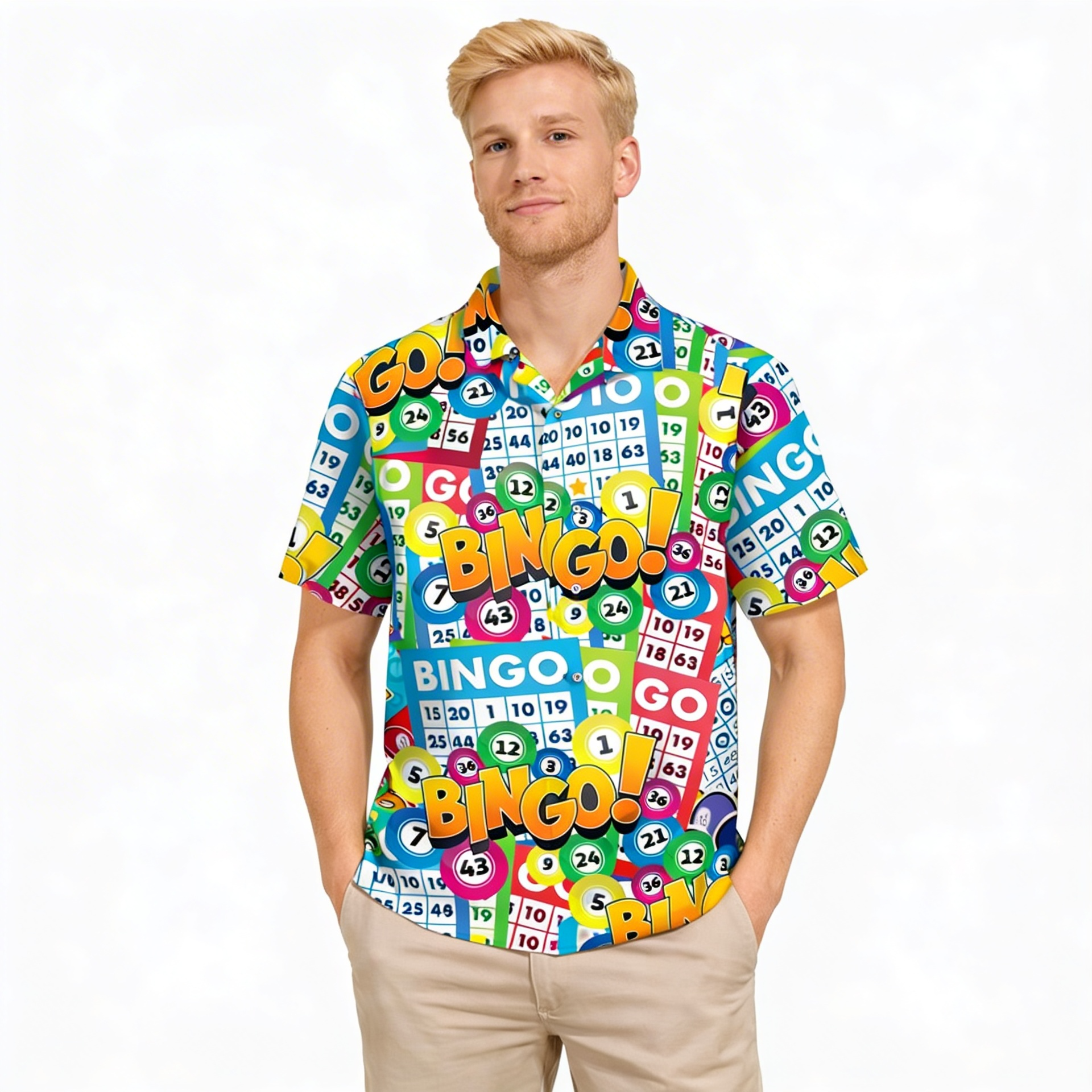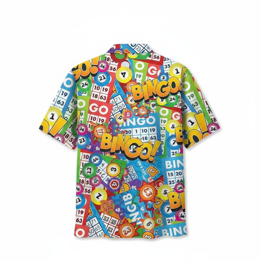 Dit vrolijke overhemd is bedrukt met een kleurrijk bingo-thema. Overal zie je bingokaarten, ballen met nummers en grote “BINGO!” teksten. De felle kleuren maken het speels en opvallend. Perfect voor een themafeest of gezellige spelavond. De korte mouwen zorgen voor comfort. Een echte blikvanger!