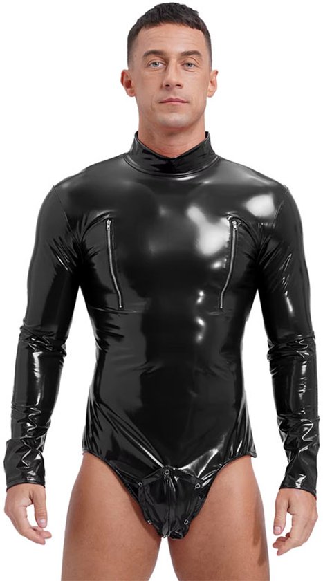 Deze opvallende heren bodysuit is gemaakt van hoogwaardig lakleer met een glanzende afwerking en een zachte, comfortabele pasvorm. Het ontwerp bevat lange mouwen, een hoge hals, ritsdetails op de borst en een afneembare pouch aan de voorzijde. Perfect voor themafeesten, festivals, cosplay of een gewaagde avondlook.