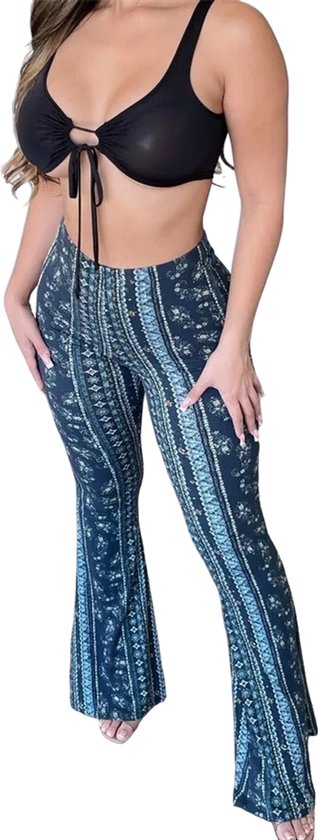 Deze blauwe flared legging heeft een opvallend bohemian patroon dat direct de aandacht trekt. De hoge tailleband zorgt voor een comfortabele en flatterende pasvorm. Gemaakt van een zachte, rekbare stof die soepel meebeweegt. De uitlopende pijpen geven een retro flair aan je look. Ideaal voor dagelijks gebruik of een festivaloutfit.