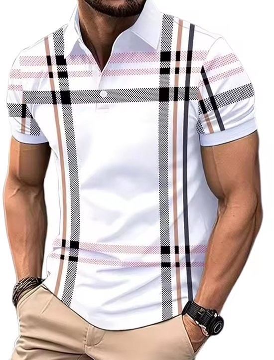 Deze witte herenpolo is een moderne eyecatcher met een strak ruitpatroon in zwart, roze en beige. De combinatie van kleuren zorgt voor een frisse en stijlvolle uitstraling. De polo is gemaakt van zachte, ademende stof met lichte stretch voor optimaal draagcomfort.