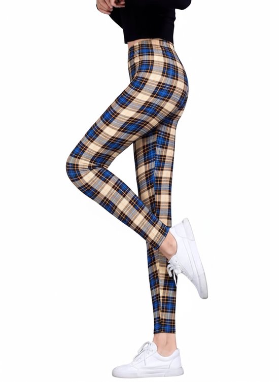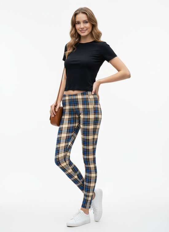 Trendy legging met beige-blauw ruitpatroon, gemaakt van rekbare stof die comfortabel aansluit. Ideaal voor een casual look met sneakers en een basic top. Stijlvol, veelzijdig en geschikt voor elke dag.