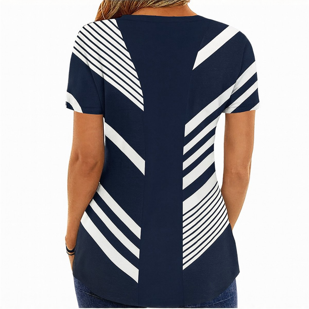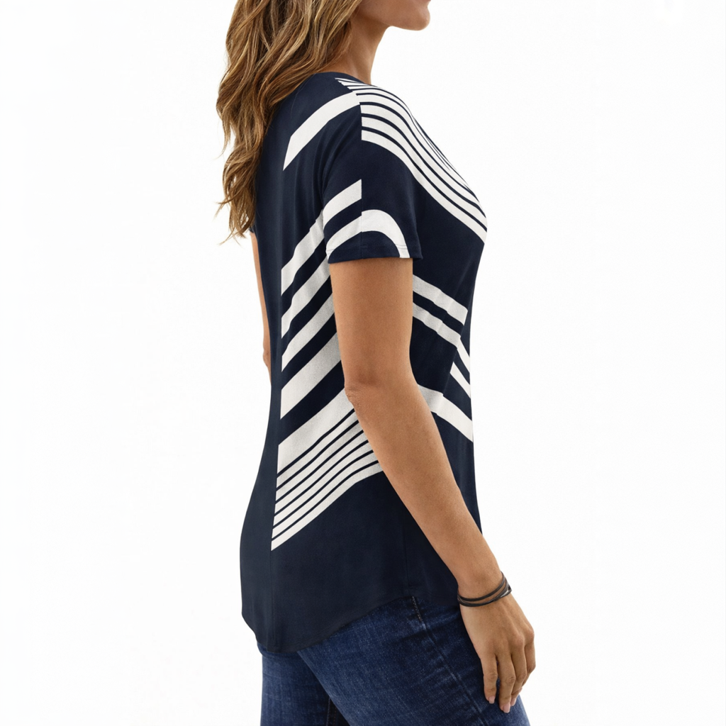 Dit donkerblauwe T-shirt heeft een V-hals en korte mouwen. Het is afgewerkt met een opvallend wit geometrisch streeppatroon. De stof voelt zacht en comfortabel aan. Ideaal voor een sportieve, casual look. Combineer het met jeans of shorts voor een complete outfit.