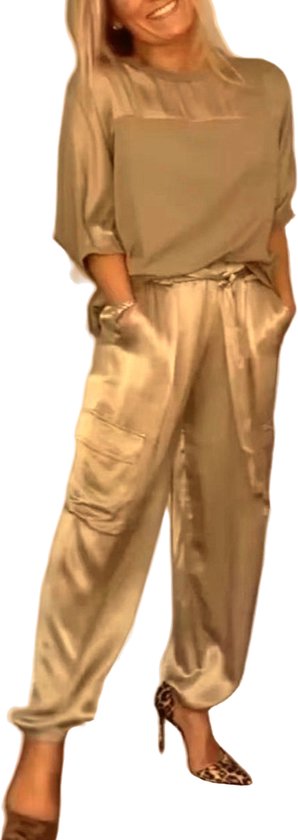 Ga voor een moeiteloos chique uitstraling met deze prachtige kledingset met satijn look. De combinatie van een soepelvallende top en een comfortabele broek zorgt voor een stijlvolle outfit die perfect is voor zowel dagelijks gebruik als speciale gelegenheden. De subtiele glans geeft de set een luxe uitstraling zonder in te leveren op draagcomfort.