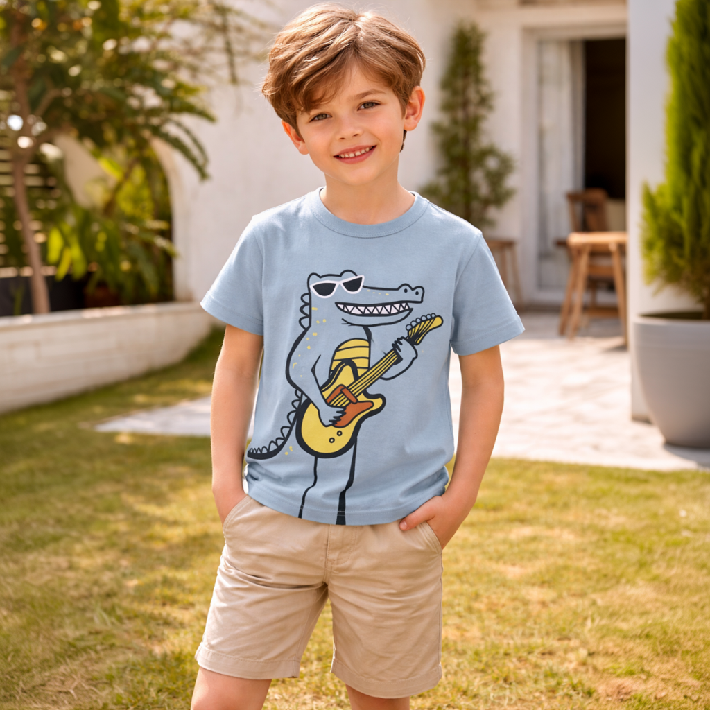 Deze katoenen dinosaurusshirt is perfect voor kinderen van 4 tot 10 jaar. Gemaakt van zacht en ademend katoen, ideaal voor actieve avonturiers. Op de voorkant staat een kleurrijke en grappige dinosaurus met een stoere zonnebril. De vrolijke print zorgt meteen voor een glimlach op ieder gezicht. Dankzij de comfortabele pasvorm is het shirt geschikt voor zowel schooldagen als speelmiddagen. Een leuke mix van cool en grappig – precies wat jonge dinofans willen!