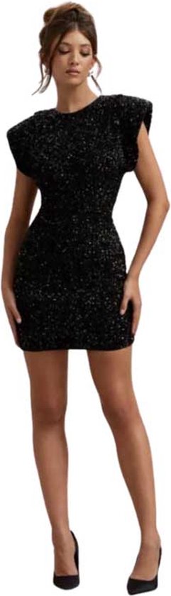 Elegante zwarte glitterjurk met opvallende schouders, perfect als galajurk voor dames die houden van een vleugje glans en stijl.