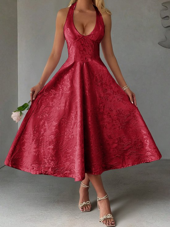 De jurk is ontworpen met een aansluitend bovenstuk en een verleidelijke halterhals, waardoor je schouders en halslijn mooi worden geaccentueerd. De taille sluit perfect aan en loopt vervolgens uit in een wijde, zwierige rok die zorgt voor een elegante en vrouwelijke silhouet. De subtiele jacquard structuur in de stof geeft de jurk een extra luxe uitstraling.
