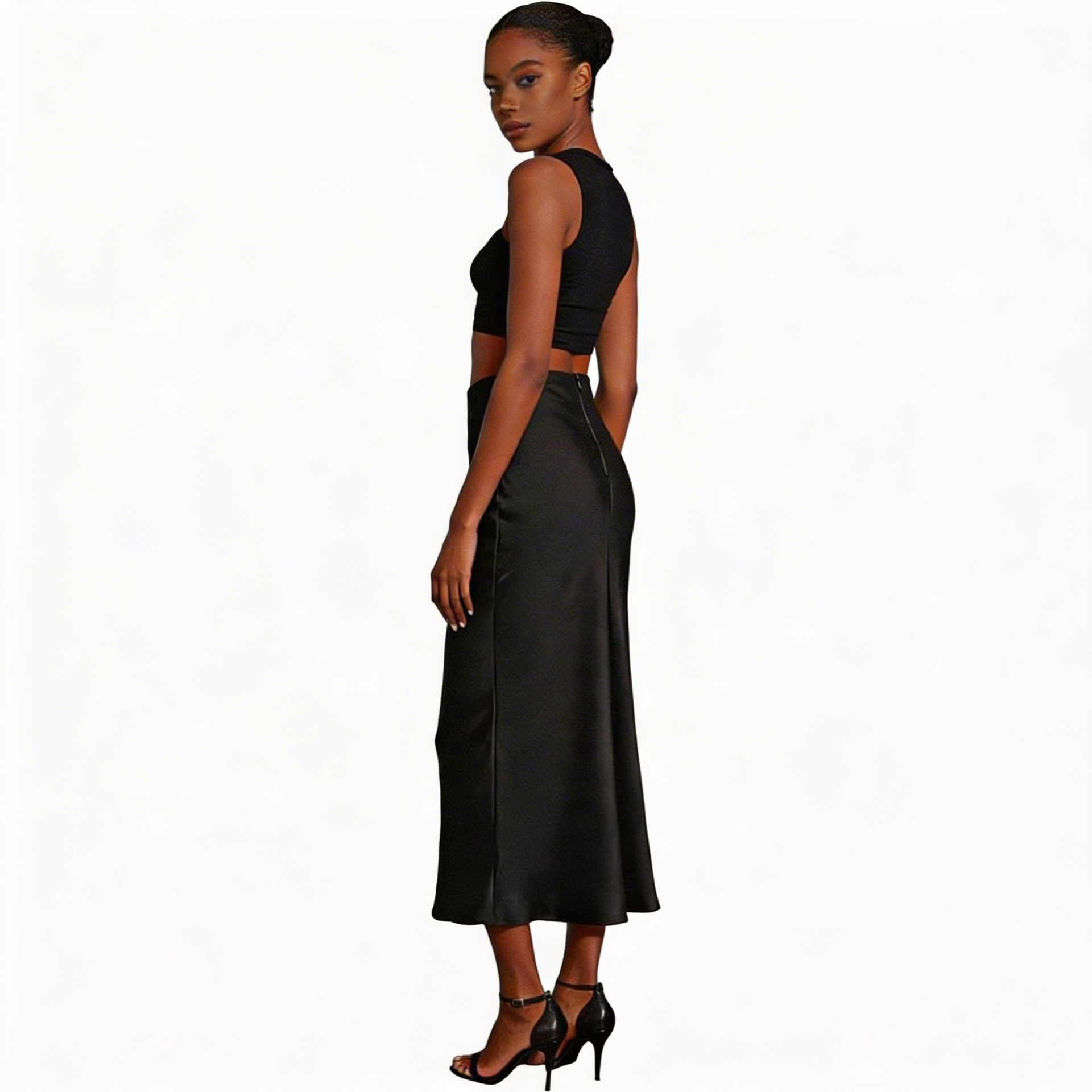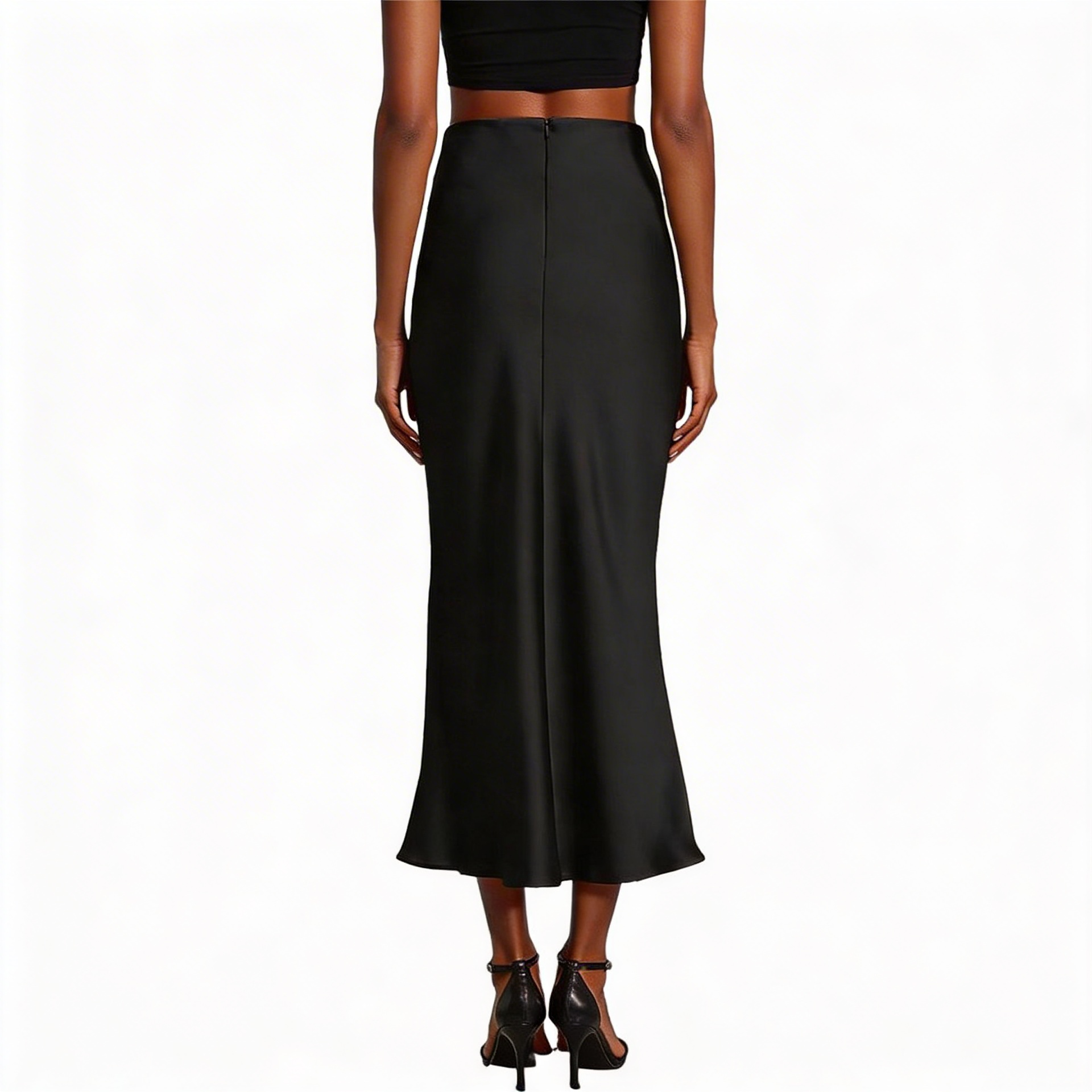 Deze zwarte satijnen midi rok is een stijlvolle essential voor elke garderobe. Het ontwerp met hoge taille en rechte, licht uitlopende pasvorm volgt het lichaam op een elegante manier zonder strak te zitten. De zachte, gladde satijnstof met een verfijnde glans geeft de rok een luxe uitstraling en voelt comfortabel aan op de huid. Dankzij de tijdloze zwarte kleur is de rok eindeloos te combineren: draag met een blouse en hakken voor een chique avondlook, of combineer met een basic top en sandalen voor een moderne, casual outfit. Een veelzijdige rok die geschikt is voor zowel dagelijks gebruik als speciale gelegenheden.