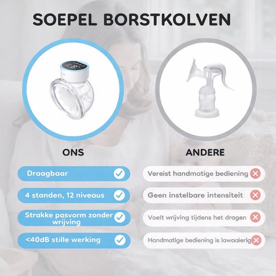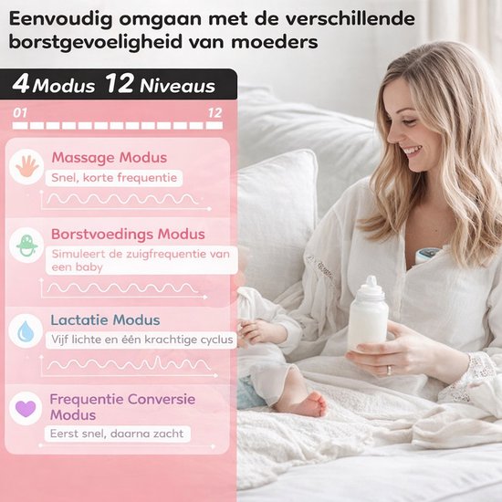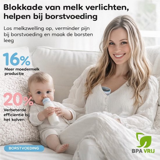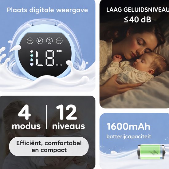De borstkolf beschikt over een krachtige maar stille motor (<40 dB), waardoor je discreet kunt kolven zonder storend geluid. Met maar liefst 4 verschillende modi en 12 instelbare niveaus pas je de kolf eenvoudig aan jouw persoonlijke behoeften en gevoeligheid aan. Dit zorgt voor een comfortabele en natuurlijke kolfervaring. Het apparaat is voorzien van een duidelijk digitaal display, waarmee je eenvoudig de instellingen kunt aanpassen en de tijd kunt bijhouden. De geïntegreerde 1600mAh batterij zorgt voor langdurig gebruik zonder dat je continu hoeft op te laden. Daarnaast is de borstkolf gemaakt van BPA-vrije materialen, wat veilig is voor jou en je baby. Dankzij het ergonomische ontwerp en de brede pasvorm sluit de borstkolf perfect aan, wat helpt bij een efficiënte melkafname en het verminderen van ongemak. Belangrijkste kenmerken: Handsfree en draagbaar ontwerp Zeer stil in gebruik (<40 dB) 4 modi en 12 instelbare niveaus Krachtige 1600mAh oplaadbare batterij Duidelijk en gebruiksvriendelijk digitaal display BPA-vrij en veilig materiaal Comfortabele pasvorm voor optimaal gebruik Geschikt voor dagelijks gebruik, thuis en onderweg Met deze borstkolf kies je voor gemak, comfort en betrouwbaarheid. Een onmisbaar hulpmiddel voor iedere moeder die efficiënt en ontspannen wil kolven.