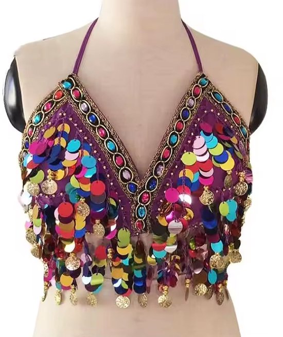 Deze kleurrijke buikdans-top is versierd met glanzende pailletten en fonkelende sierstenen. De verstelbare halter- en rugsluiting zorgen voor een perfecte pasvorm en extra comfort. Dankzij de lichte en soepele stof beweegt de top prachtig mee tijdens het dansen. Ideaal voor buikdansoptredens, carnaval, themafeesten en festivals.