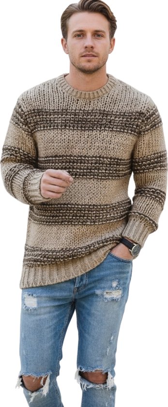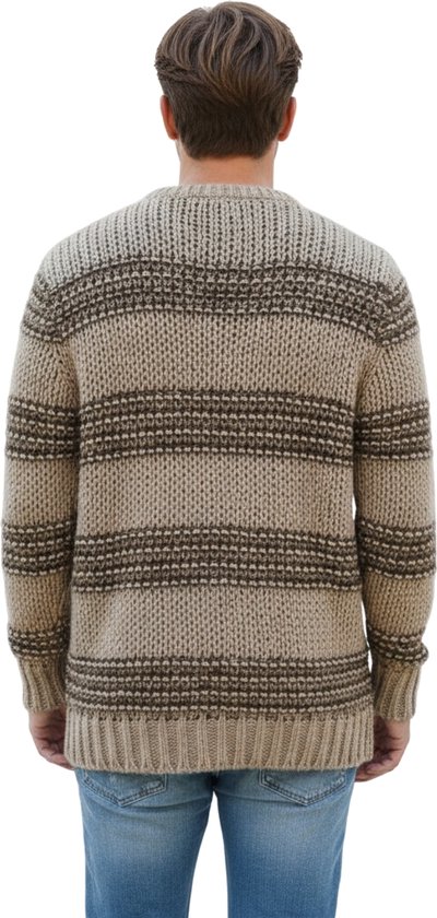 De trui is grofgebreid en voelt warm en comfortabel aan. Hij heeft een beige basiskleur met brede donkerbruine horizontale strepen. De ronde hals zorgt voor een klassieke en tijdloze uitstraling. De pasvorm is relaxed, ideaal voor een casual look. Met zijn design sluit hij perfect aan bij de nieuwste mode. Deze trui combineert stijl en comfort.