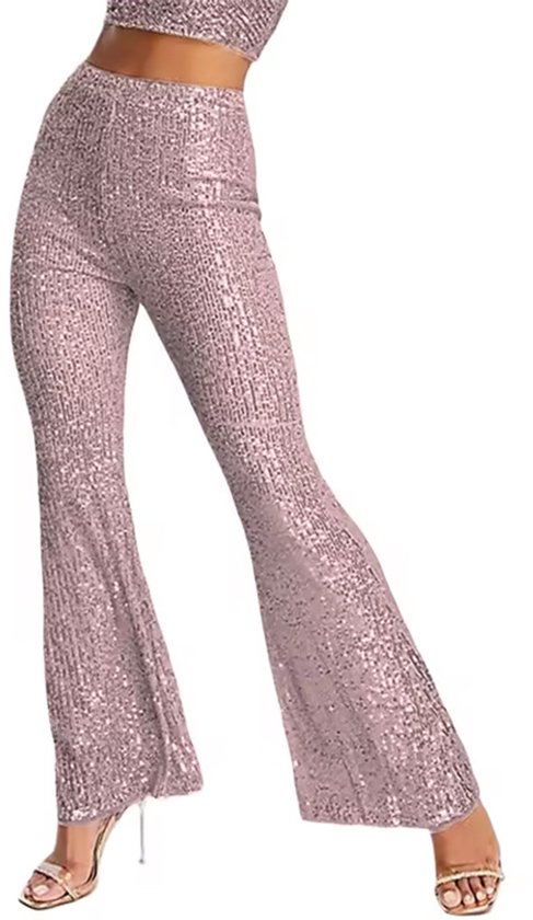 Deze opvallende roze glitterbroek is een echte eyecatcher dankzij de sprankelende pailletten. De flared pijpen geven een retro touch en zorgen voor een elegante look. Ideaal om te combineren met hakken en een bijpassende top voor een feestelijke outfit. De broek zit comfortabel dankzij het stretch legging-materiaal dat mooi aansluit op het lichaam.