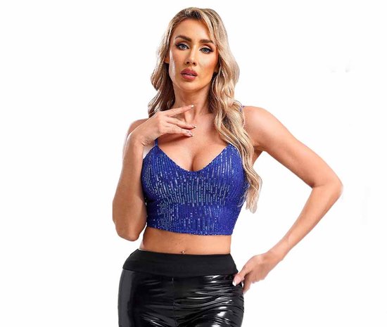 Het shirt is een mouwloze crop top met smalle spaghettibandjes. Het heeft een diepe halslijn en een aansluitende pasvorm. De stof is volledig bedekt met glinsterende pailletten die het een feestelijke uitstraling geven. Het shirt eindigt net boven de taille en accentueert het figuur.
