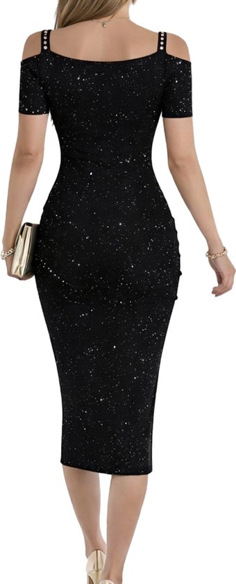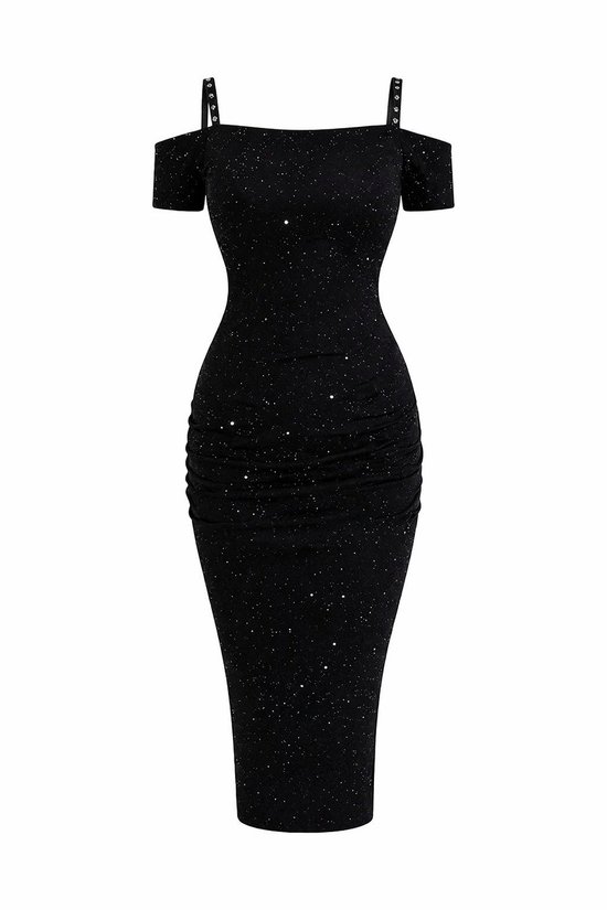 De jurk is ontworpen met een moderne off-shoulder look en subtiele bandjes, wat zorgt voor een chique en verfijnde uitstraling. De lichte glitterdetails geven een luxe touch, terwijl de zachte en elastische stof zorgt voor een comfortabele pasvorm die mooi aansluit op het lichaam. De midi lengte maakt deze jurk zowel elegant als veelzijdig.