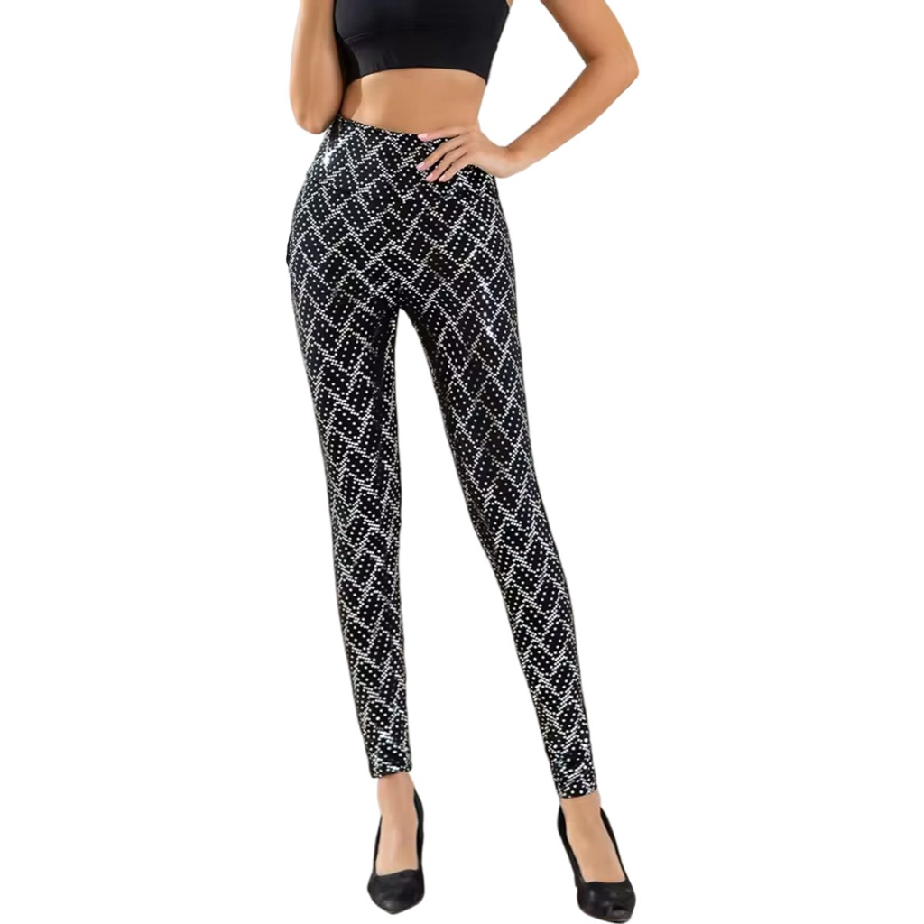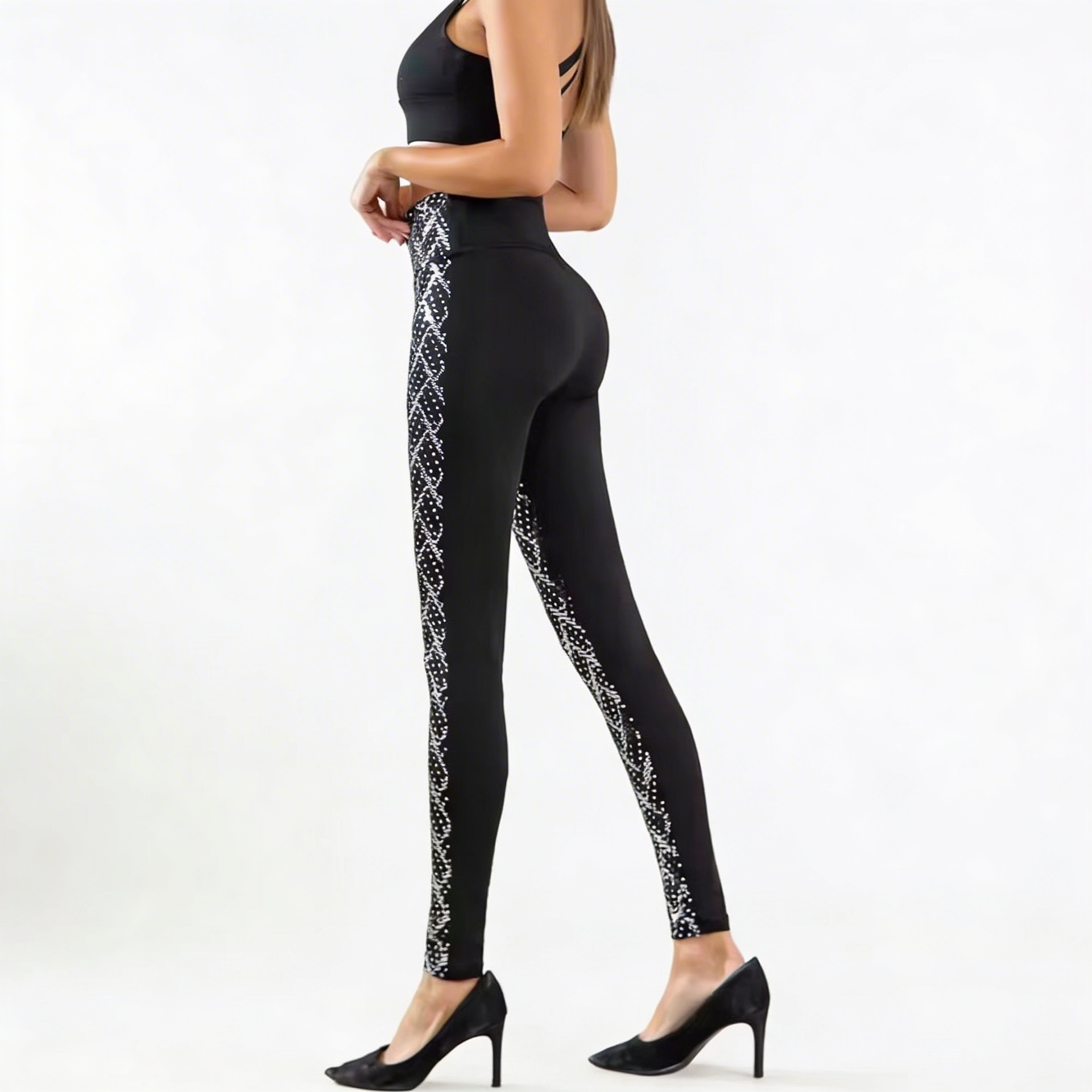 Deze zwarte legging straalt luxe en elegantie uit door het opvallende strass-patroon. De hoge taille accentueert je figuur en biedt tegelijkertijd comfort. Dankzij de rekbare stof sluit de legging mooi aan op het lichaam. Het fonkelende design maakt hem ideaal voor feestjes, avondjes uit of speciale gelegenheden. Combineer met hakken en een top voor een glamoureuze look. Een echte eyecatcher die glamour en comfort perfect samenbrengt.