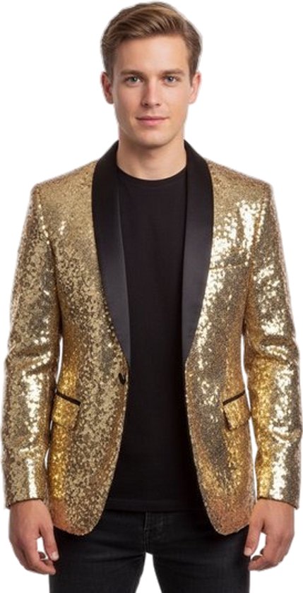 Dit goudkleurige colbert is een echte blikvanger dankzij de fonkelende pailletten.De zwarte satijnen revers zorgen voor een chique contrast en een luxe uitstraling.Perfect voor feestelijke gelegenheden, optredens of een stijlvolle partylook.De comfortabele pasvorm maakt dat je er niet alleen goed uitziet, maar je ook vrij kunt bewegen.Combineer het met een zwarte broek en shirt voor een tijdloze combinatie.Met dit gouden colbert straal je zelfvertrouwen en klasse uit.