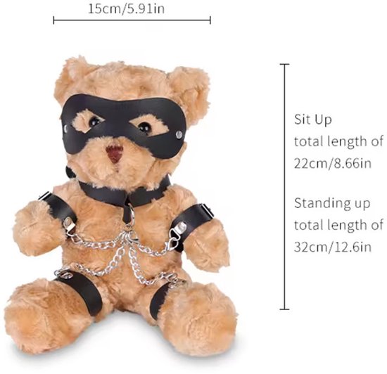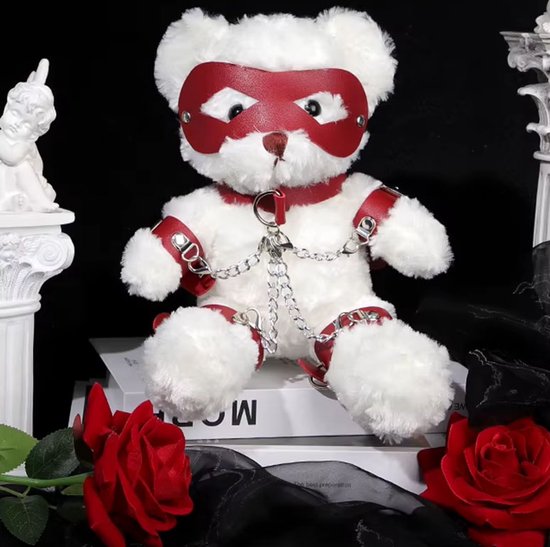 Deze ondeugende teddybeer is niet zomaar een knuffel. Met zijn zachte, witte vacht en speelse accessoires is hij het perfecte cadeau voor koppels die graag een vleugje humor en spanning combineren. De beer draagt een chique zwarte choker met ketting, een leren masker en mini-handboeien – allemaal met oog voor detail gemaakt.