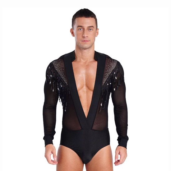 Deze opvallende heren bodysuit is gemaakt van zwarte, doorschijnende mesh-stof en afgewerkt met glinsterende pailletten en franjes op de schouders. De diepe V-hals zorgt voor een gedurfde, stijlvolle uitstraling. De nauwsluitende pasvorm benadrukt het lichaam en biedt comfort en bewegingsvrijheid. Perfect voor dansoptredens, podiumshows, feestavonden of extravagante evenementen.