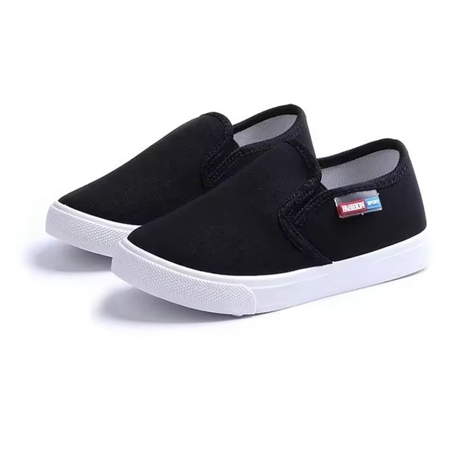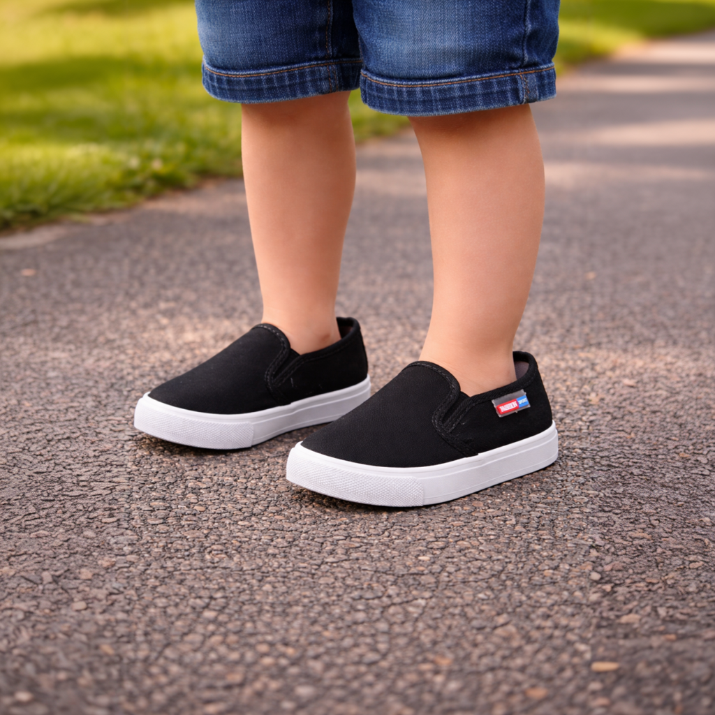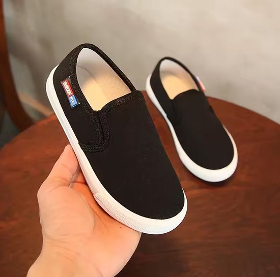 Deze zwarte unisex canvas kinderschoenen combineren stijl met comfort. Het slip-on model maakt ze eenvoudig aan en uit te trekken, ideaal voor drukke ochtenden. De elastische inzetstukken zorgen voor een goede pasvorm en extra gemak. Dankzij de ademende canvas stof blijven kindervoeten fris, zelfs bij langdurig dragen. De witte rubberen zool biedt stevige grip en duurzaamheid. Deze schoenen zijn perfect voor dagelijks gebruik, zowel binnen als buiten. Het minimalistische ontwerp past bij elke outfit, van casual tot net iets netter. Een praktische en stijlvolle toevoeging aan iedere kindergarderobe.