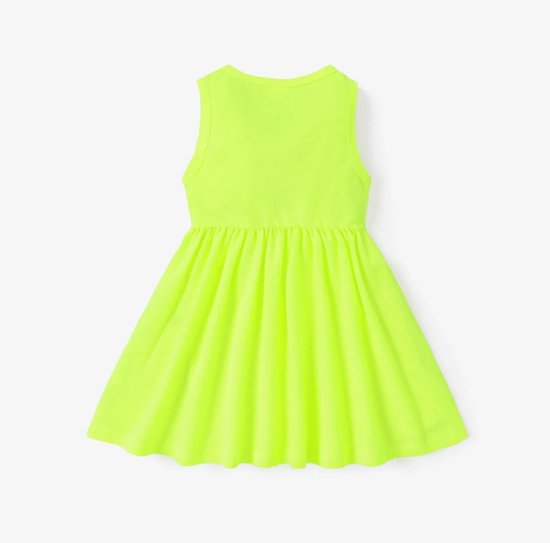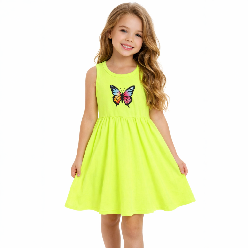 Deze vrolijke gele jurk is speciaal ontworpen voor peuters en kleuters tussen de 2 en 6 jaar. De jurk is mouwloos en heeft een ronde hals, wat zorgt voor extra draagcomfort. Op de borst prijkt een kleurrijke vlinderprint die meteen in het oog springt. De rok is wijd uitlopend en zorgt voor veel bewegingsvrijheid tijdens het spelen. Gemaakt van een zachte, ademende stof die prettig aanvoelt op de huid. Perfect voor dagelijks gebruik, feestjes of een zomerse dag in het park.