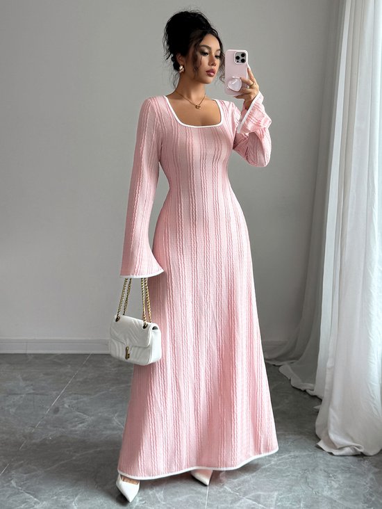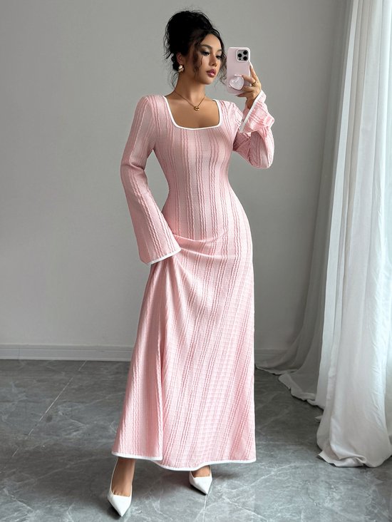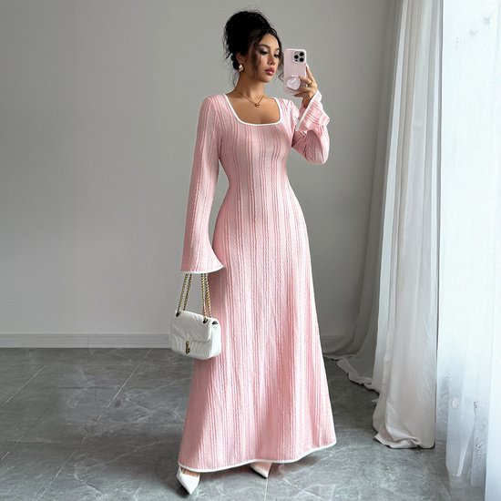 Deze lange roze jurk is de perfecte combinatie van elegantie, comfort en verfijning. Met haar flatterende pasvorm en subtiele structuur accentueert deze jurk op een prachtige manier het silhouet, waardoor je een stijlvolle en vrouwelijke uitstraling creëert. De zachte roze kleur geeft de jurk een romantische en moderne look, ideaal voor diverse gelegenheden.