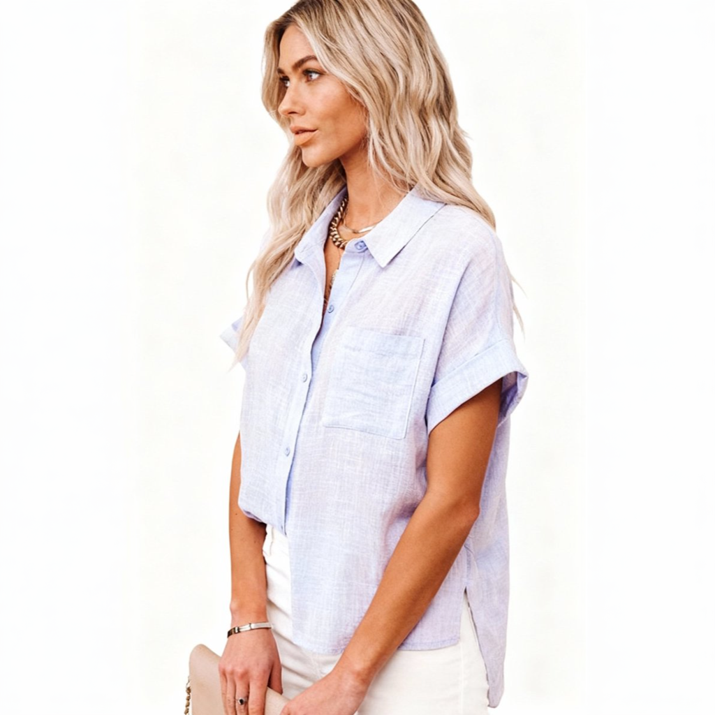 Deze licht paarse blouse biedt een frisse touch aan je outfit met haar zachte kleur en luchtige stof. Het losvallende model met opgerolde mouwen geeft een casual-chique uitstraling. Voorzien van een klassieke kraag, knoopsluiting en een subtiele borstzak. De blouse is makkelijk te combineren met lichte jeans of een witte broek. Een perfecte keuze voor lente en zomer.