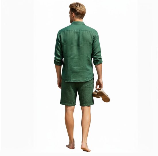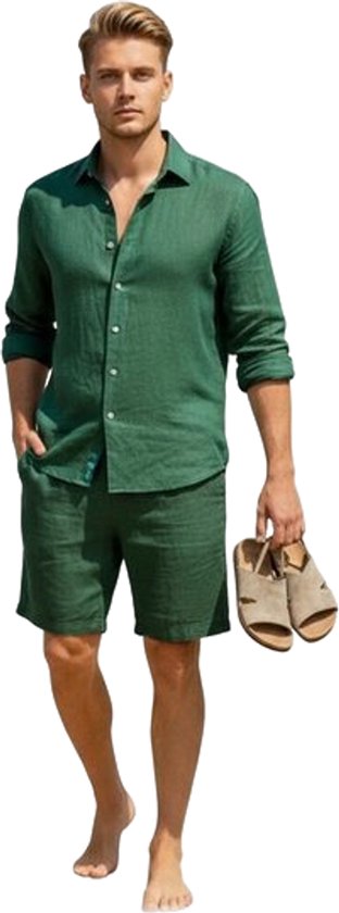 Zomerse heren kleding set in fris groen, perfect voor strand of festival. Bestaat uit een luchtige linnen blouse en een comfortabele korte broek. Ideaal voor warme dagen, combineert stijl en comfort met een relaxte uitstraling. Geschikt voor casual gelegenheden en zomerse avonturen.
