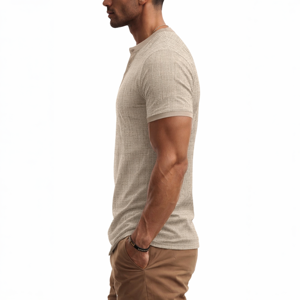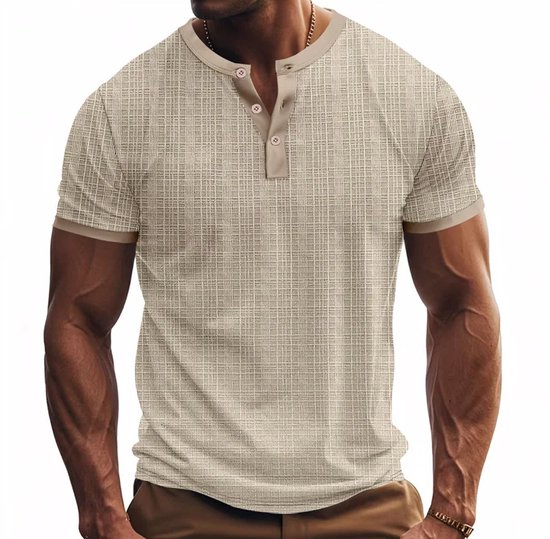 Deze stijlvolle beige herenpolo is perfect voor zomerse dagen. De linnenlook geeft het shirt een luxe, luchtige uitstraling en zorgt voor optimaal draagcomfort. Het subtiele rasterpatroon voegt diepte en textuur toe aan het design. De korte mouwen en ronde hals met knoopsluiting geven het shirt een moderne twist. Dankzij de aansluitende pasvorm benadrukt het de lichaamsbouw zonder in te leveren op comfort. Combineer het moeiteloos met chino’s of shorts voor een casual-chique outfit.