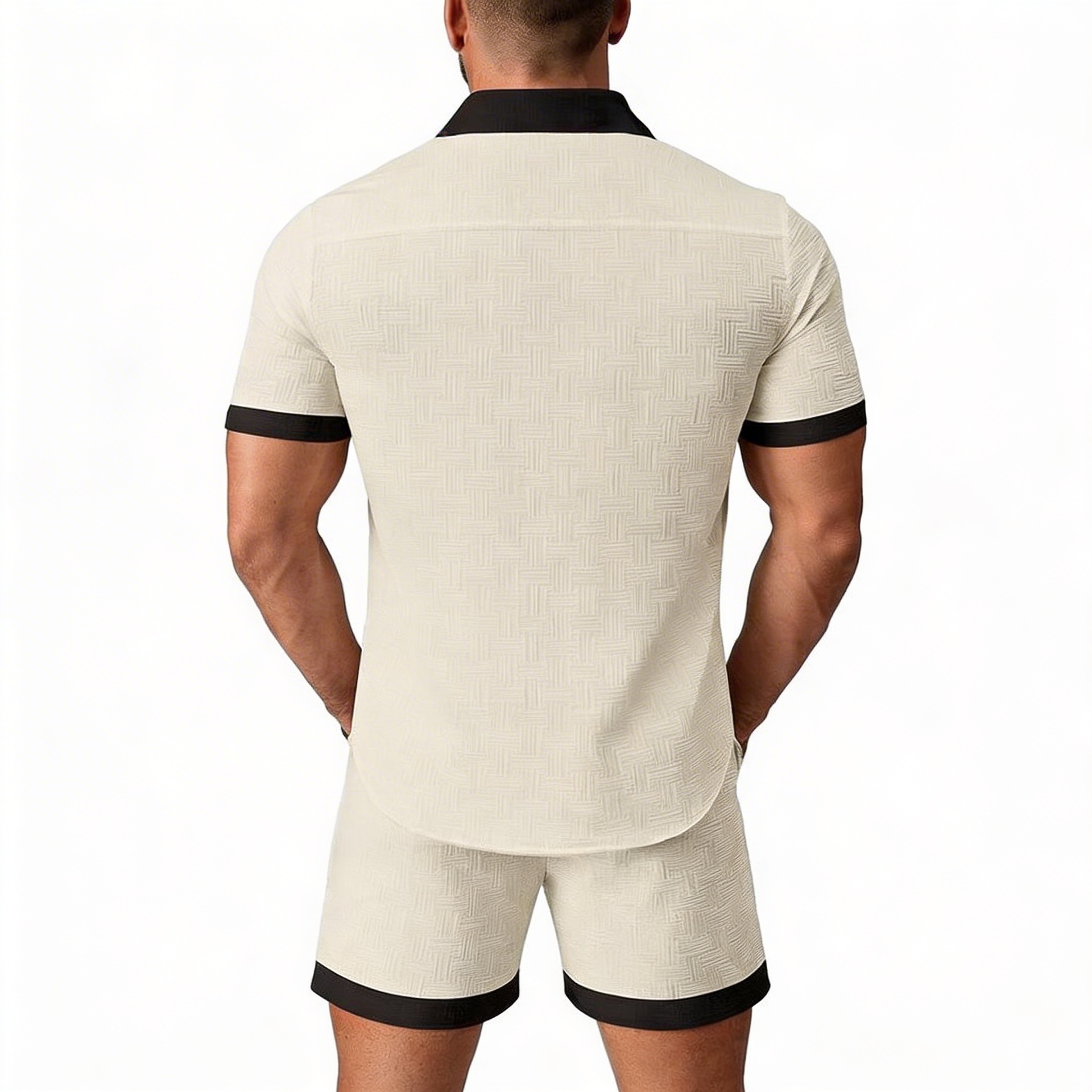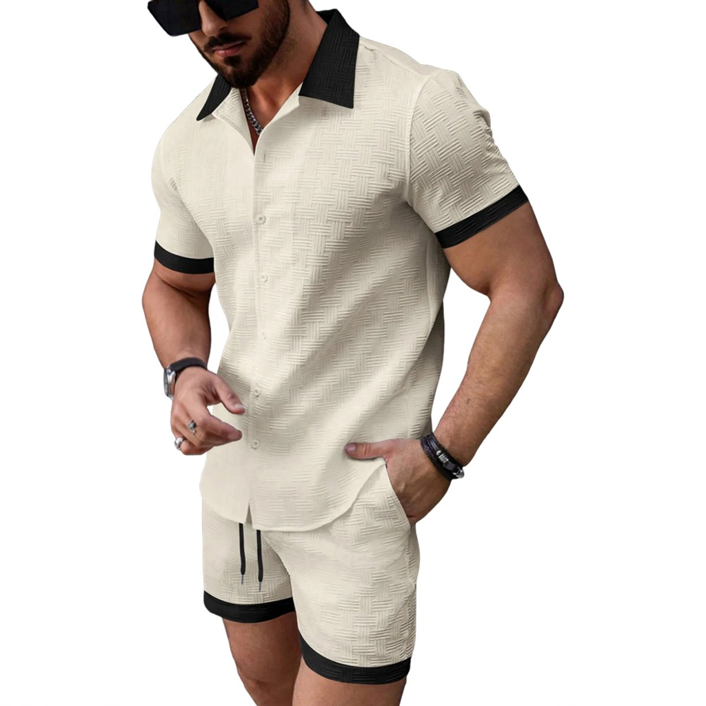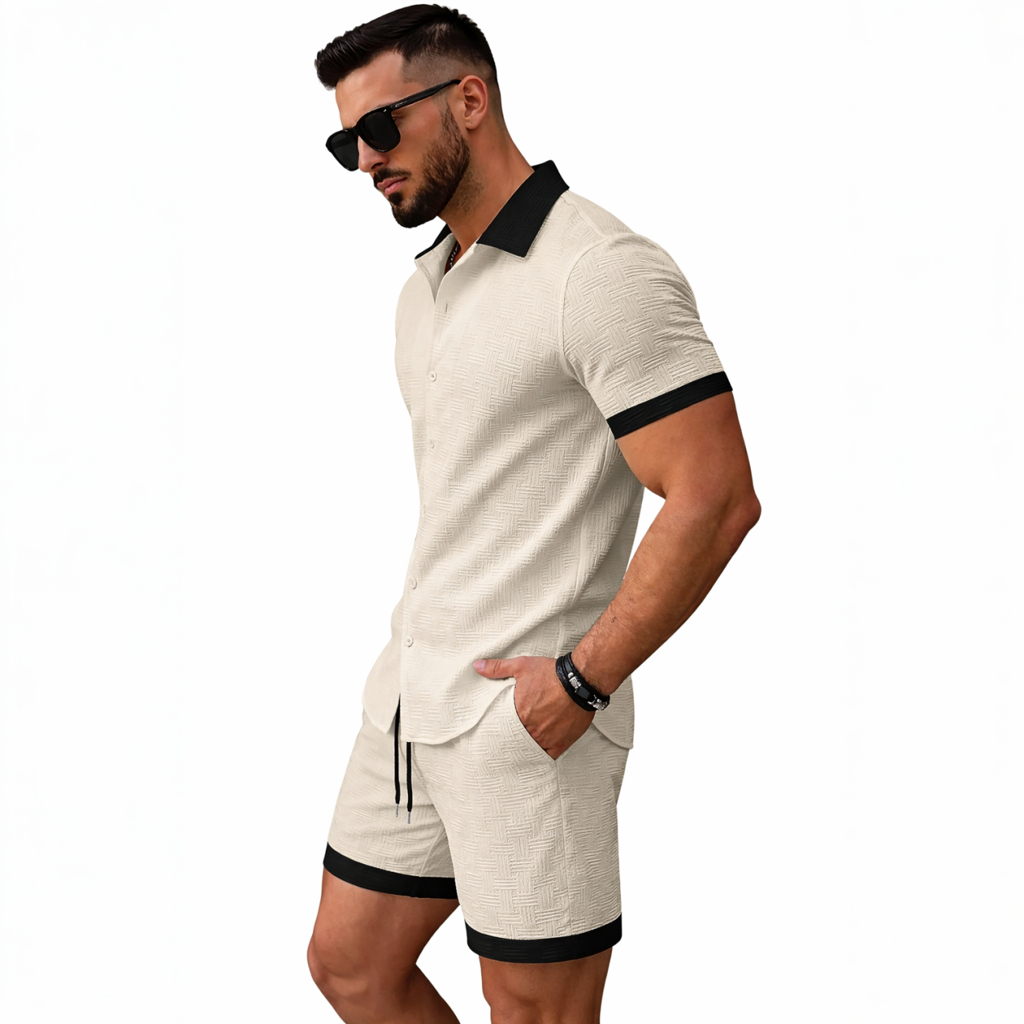 Deze zomerse herenoutfit bestaat uit een getailleerde blouse en bijpassende korte broek. De stof heeft een subtiel geweven patroon dat zorgt voor een verfijnde, moderne uitstraling. Zwarte accenten aan kraag, mouwen en broekspijpen geven een stijlvol contrast. Zowel de blouse als de broek zijn voorzien van handige zakken. Perfect voor een modieuze, comfortabele look op warme dagen.