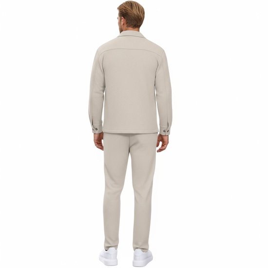Deze lounge kledingset voor heren bestaat uit een stijlvolle blouse met reverskraag en een lange broek in wit-beige tint. De zachte wafelruitstof voelt licht en comfortabel aan. Het ademende materiaal maakt de set ideaal voor dagelijks gebruik. De blouse heeft een nette knoopsluiting en een moderne uitstraling. De broek valt recht en sluit perfect aan voor een verzorgde look. Deze set combineert comfort en elegantie en volgt de nieuwste mode.