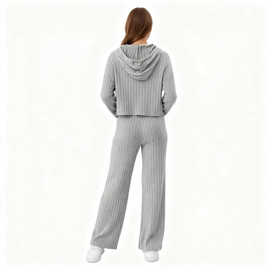 Dit stijlvolle loungepak combineert comfort en eenvoud. De hoodie heeft een relaxte pasvorm en een praktische capuchon met trekkoord. De broek valt losjes en biedt veel bewegingsvrijheid. Beide delen zijn gemaakt van een zachte, geribde stof die warm en ademend aanvoelt. De lichtgrijze kleur zorgt voor een moderne, tijdloze look. Perfect voor cozy dagen thuis of een casual look onderweg.