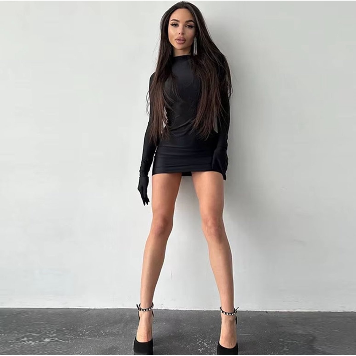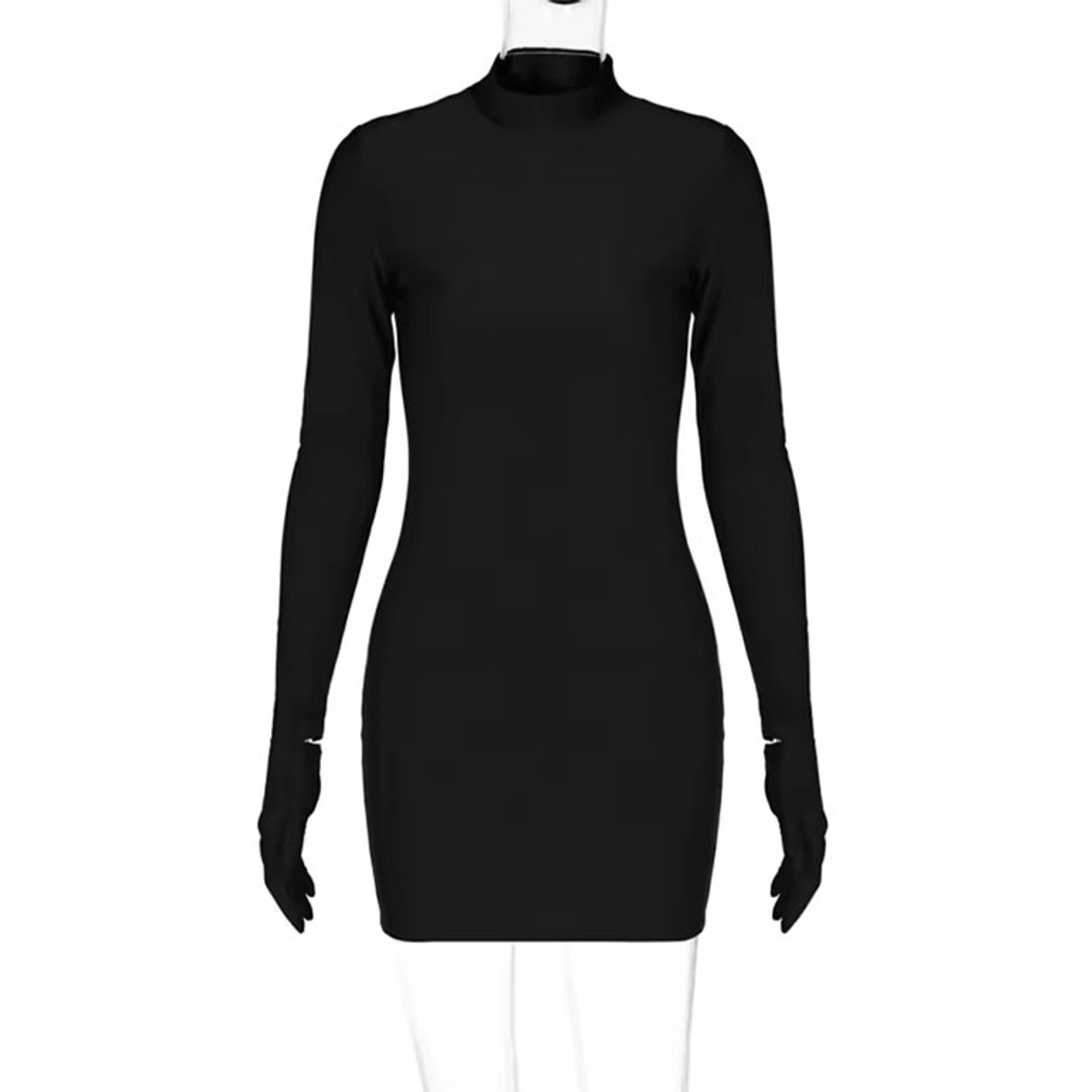 Deze elegante zwarte mini-jurk is de perfecte keuze voor een avond vol stijl en zelfvertrouwen. De aansluitende bodycon-pasvorm accentueert je silhouet op een verfijnde manier, terwijl de halve coltrui een chique touch toevoegt. De jurk heeft lange mouwen met handschoenen dat zorgt voor een moderne en luxueuze uitstraling.