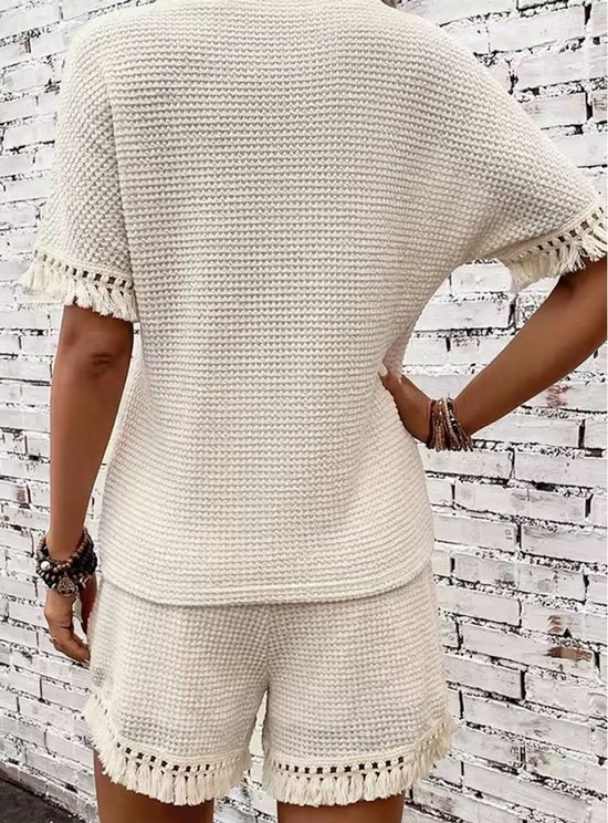 Luchtige en comfortabele set bestaande uit een beige shirt met bijpassend kort broekje. Het shirt en het broekje zijn afgewerkt met een speelss kwastjes, wat de outfit een zomerse uitstraling geeft.