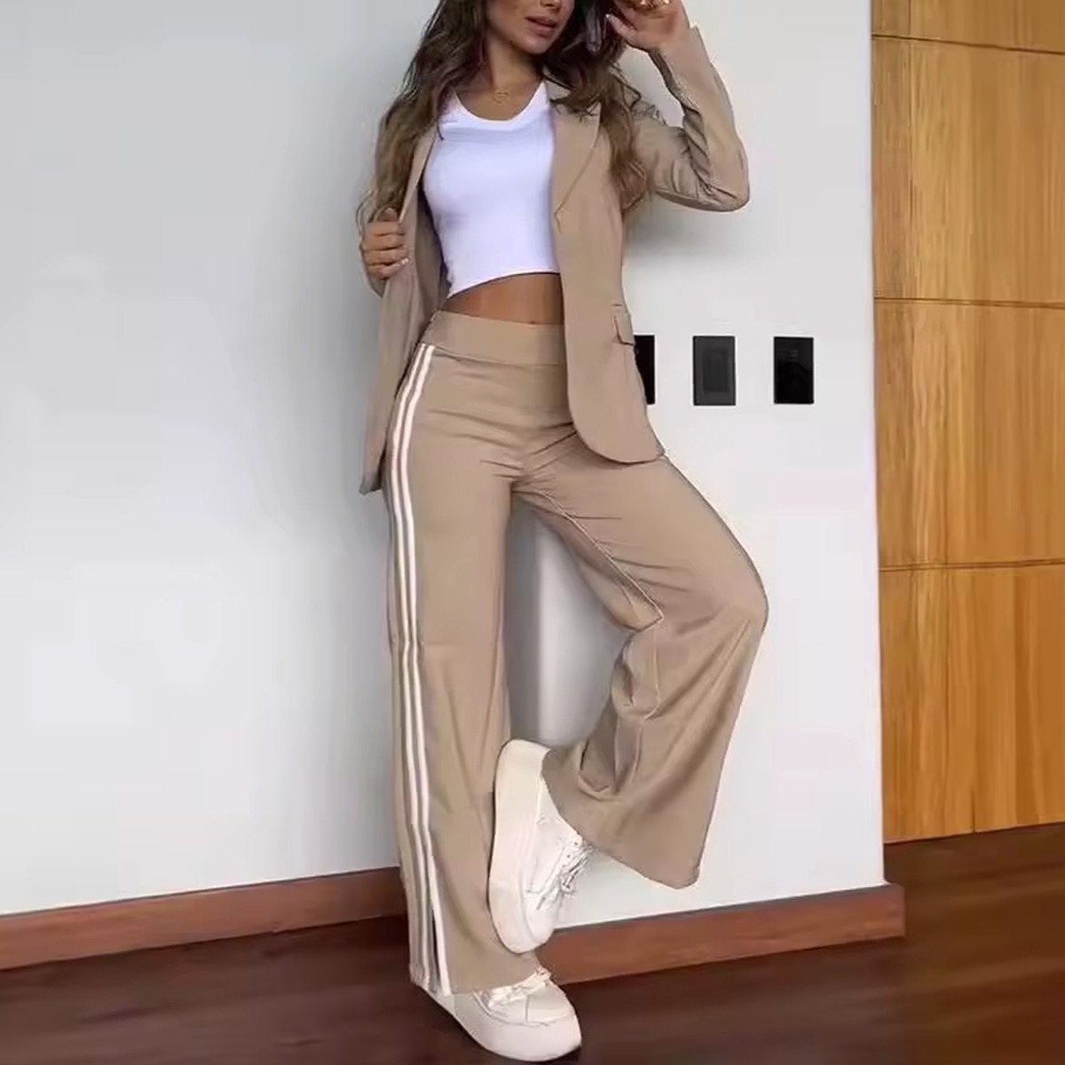 Dit elegante dames trainingspak combineert comfort met een modieuze athleisure look. De set bestaat uit een getailleerde blazer en een wijde broek met opvallende strepen langs de zijkanten. De zachte, elastische stof zorgt voor optimale bewegingsvrijheid, terwijl het stijlvolle design perfect is voor zowel casual dagen als trendy streetwear. Draag het met sneakers of boots voor een perfecte, moderne outfit die moeiteloos chic én comfortabel is.