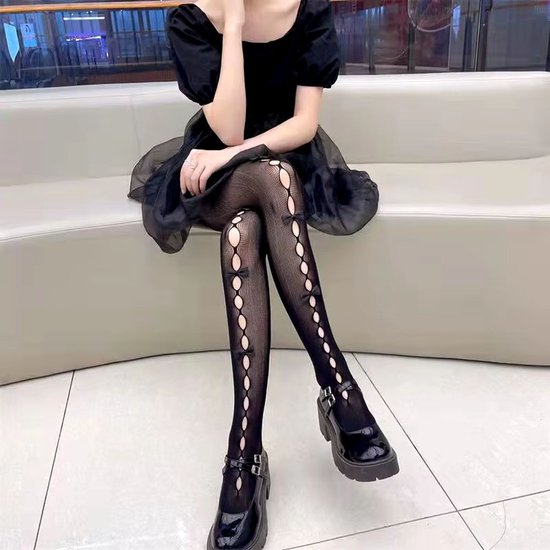 Trendy zwarte panty’s met unieke opengewerkte designs en elegante strikjes. Voeg een vleugje glamour toe aan je outfit met deze comfortabele, rekbare panty’s. One size, perfect voor elke gelegenheid!