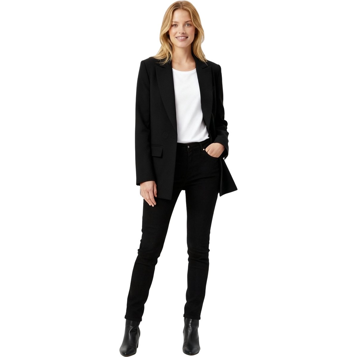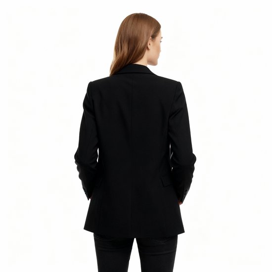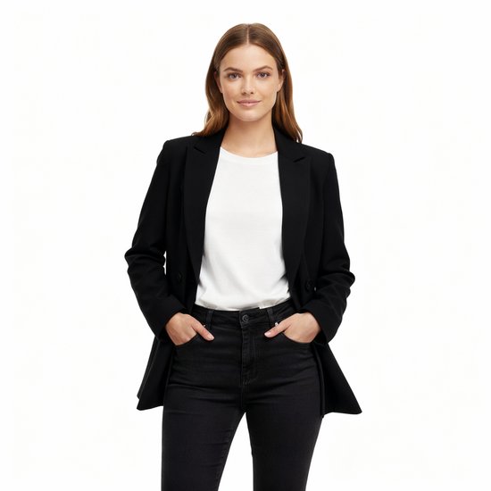 Deze zwarte blazer is een veelzijdige essential voor elke garderobe. Het double-breasted ontwerp met stijlvolle reverskraag geeft een krachtige, professionele look. Dankzij de licht getailleerde snit sluit het jasje mooi aan op het lichaam, terwijl de lange mouwen en verzorgde afwerking zorgen voor een verfijnde uitstraling. Perfect voor formele outfits met een blouse en pantalon, maar ook moeiteloos te stylen met jeans en sneakers voor een moderne, casual chique look.