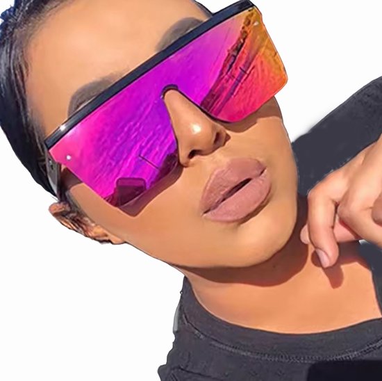 Deze oversized zonnebril heeft een futuristische uitstraling. De spiegelende glazen lopen over van roze naar geel voor een opvallend effect. Het zwarte montuur geeft de bril een stoere touch. Perfect voor festivals, stranddagen of streetstyle outfits. De bril combineert mode met UV-bescherming.