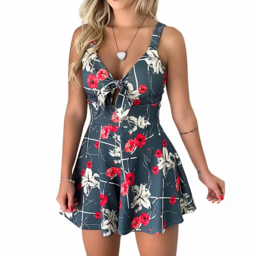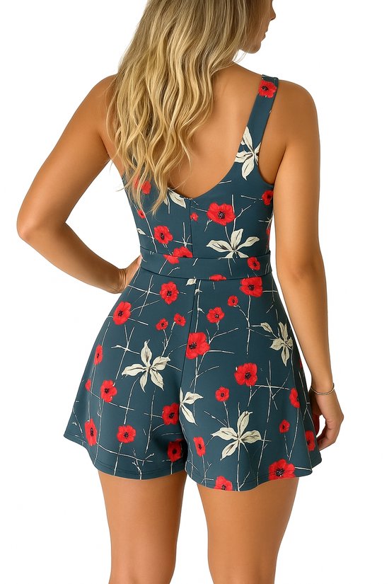 Deze elegante playsuit heeft een diepe grijze ondergrond die prachtig contrasteert met de helderrode bloemenprint. De brede schouderbanden en de V-hals met strikdetail zorgen voor een vrouwelijke en speelse uitstraling. De taille wordt mooi geaccentueerd waardoor het figuur extra flatterend uitkomt. Het korte, licht uitlopende broekje geeft een luchtig en comfortabel gevoel. De stof voelt zacht aan en beweegt soepel mee, ideaal voor warme zomerdagen. Perfect voor zowel een casual dagje uit als een stijlvolle avondlook.