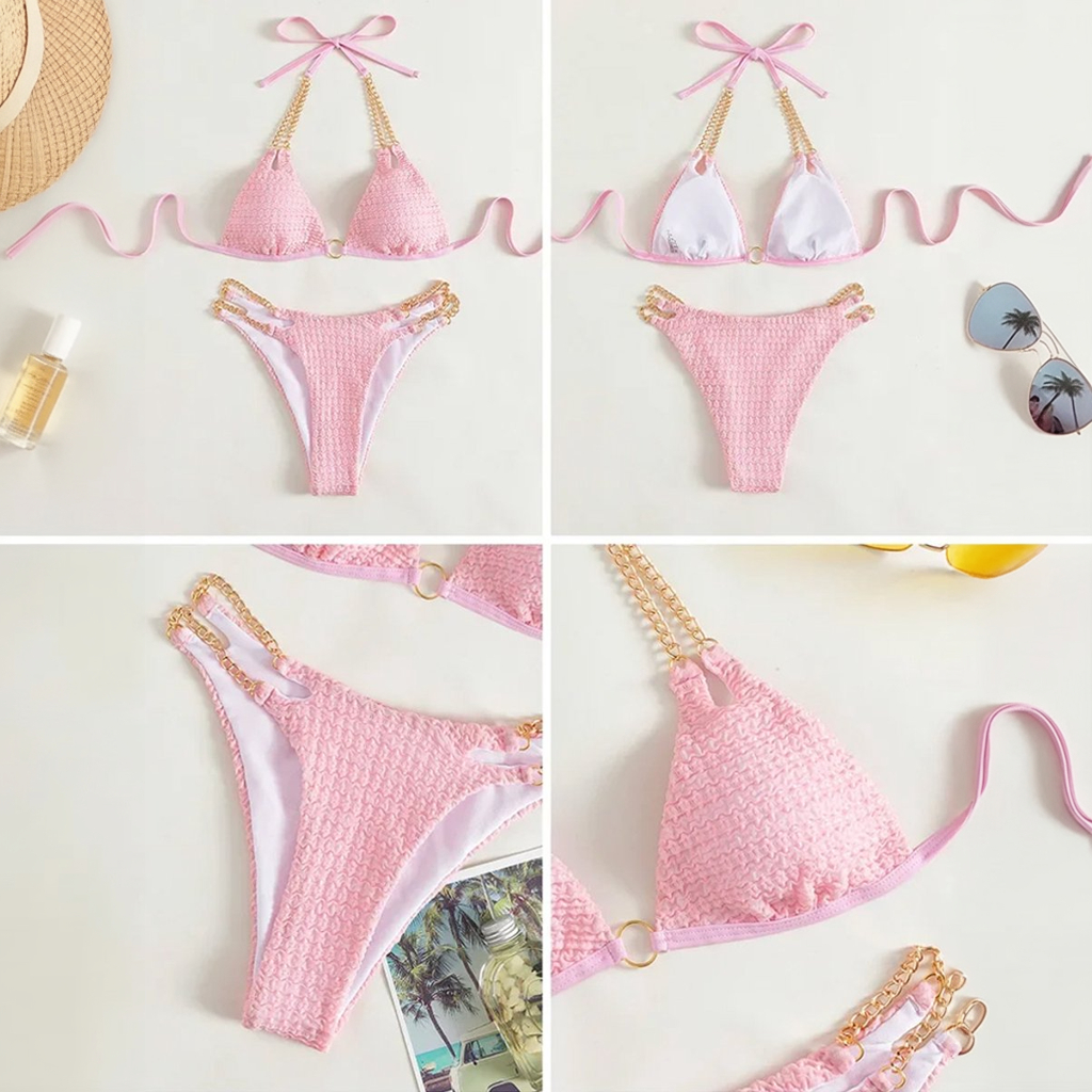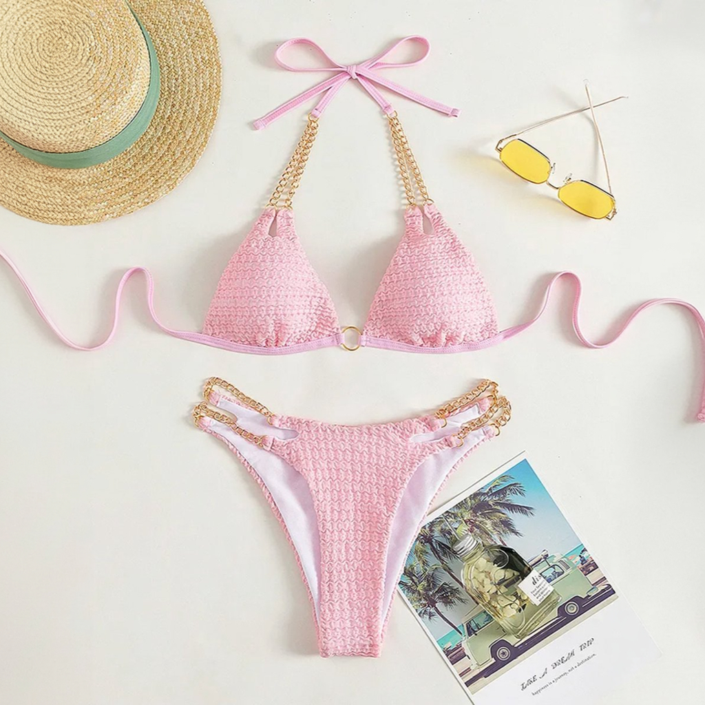 Deze lichtroze bikini straalt vrouwelijkheid en elegantie uit dankzij de verfijnde structuurstof. De gouden kettingbandjes aan de top en het broekje geven een luxe detail dat meteen opvalt. Met een speelse uitsnijding en ringdetails is dit een echte eyecatcher. Het broekje is hoog uitgesneden en flatteert het figuur. Perfect voor een glamoureuze stranddag of een zonnige poolside look.
