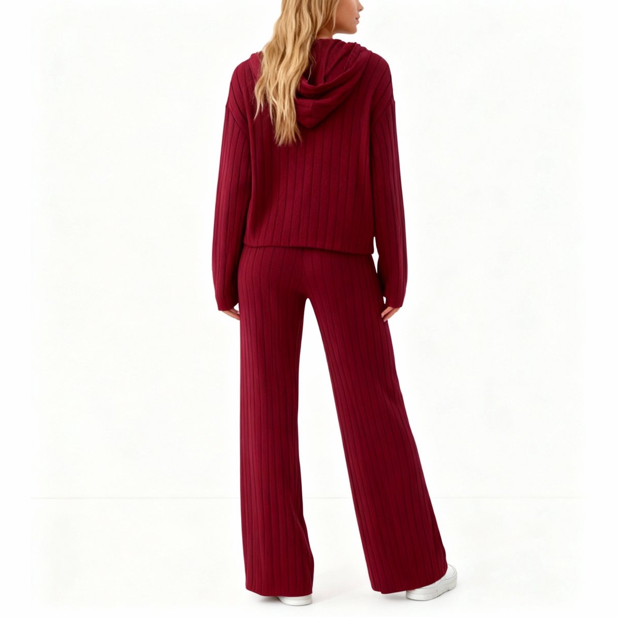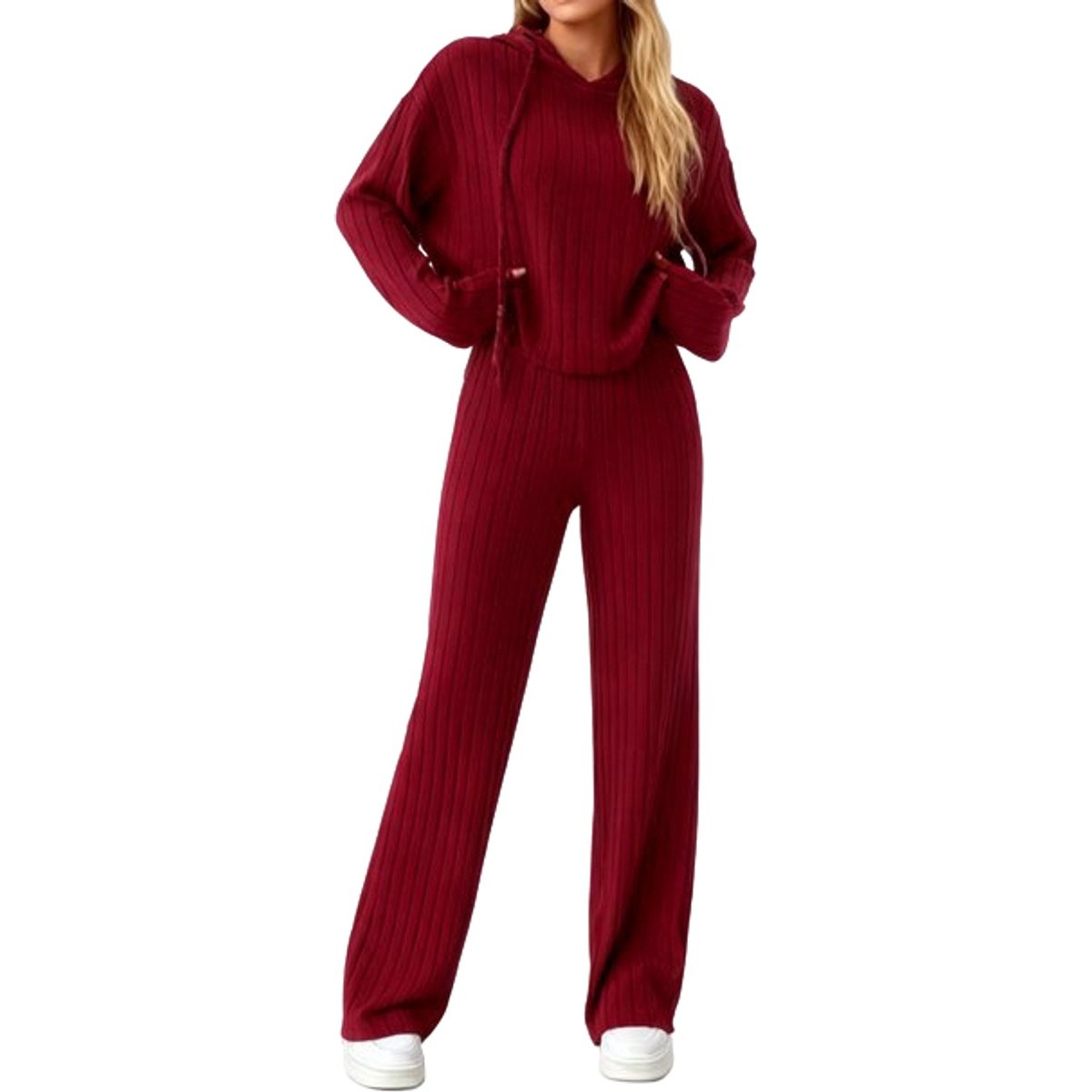 De Ribstof Lounge Kledingset voor dames biedt ultiem comfort in een stijlvolle look. De zachte ribstof voelt prettig aan op de huid en beweegt moeiteloos mee. De bordeauxrode kleur geeft de set een chique en moderne uitstraling. De hoodie heeft een relaxte pasvorm die perfect is om in te chillen. De bijpassende broek met wijde pijpen zorgt voor een casual maar modieuze look. Ideaal voor ontspanning, dagelijkse outfits of een comfortabele dag thuis.