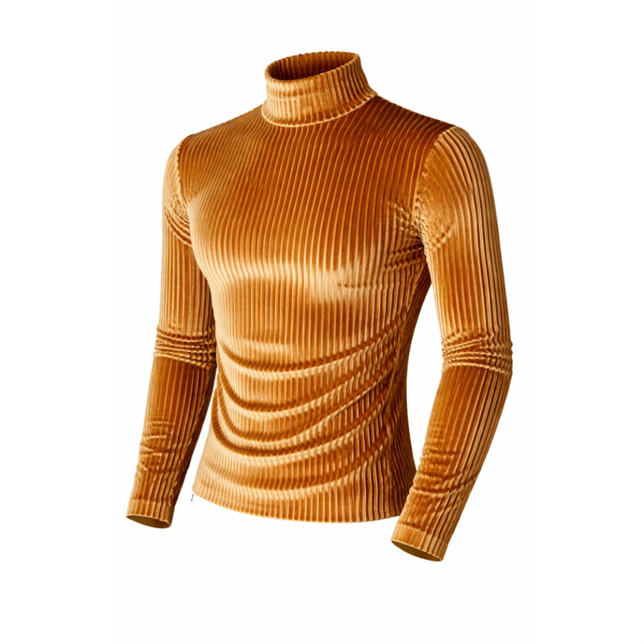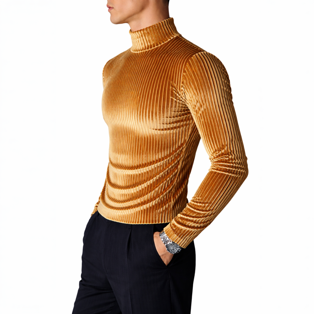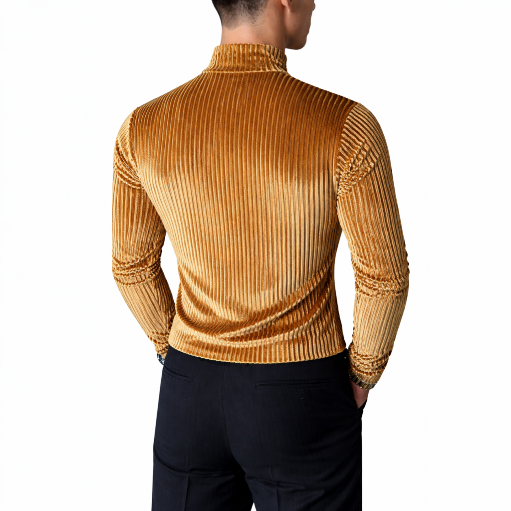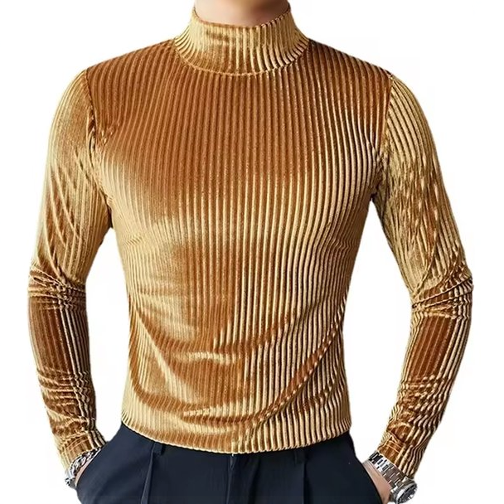 Deze fluwelen herentrui straalt luxe en stijl uit dankzij de glanzende goudkleur en ribstructuur. De hoge kraag geeft de trui een chique en moderne uitstraling. De stof is dik voor een shirt, maar dun en soepel voor een trui – ideaal voor feestelijke of nette gelegenheden. Het materiaal is zacht en elastisch, waardoor het mooi aansluit op het lichaam. Let op: dit artikel valt klein, bestel een maat groter voor een comfortabele pasvorm.