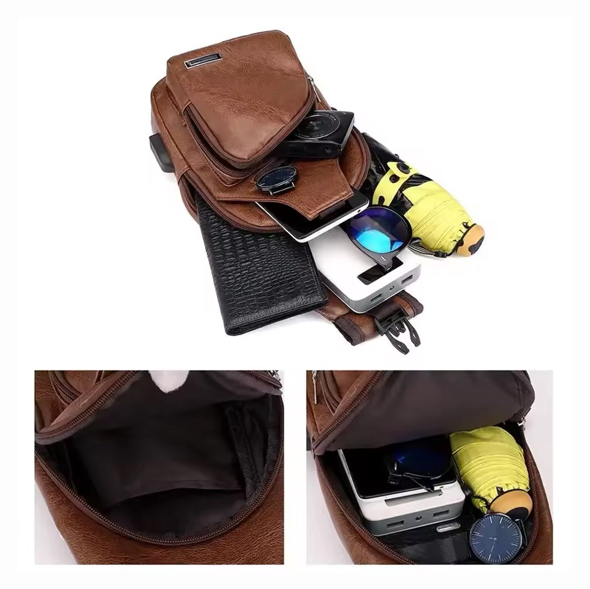 Deze moderne schoudertas is gemaakt van hoogwaardig kunstleer en combineert stijl met functionaliteit. Dankzij de ingebouwde USB- en oortjespoort blijf je onderweg eenvoudig verbonden. De tas heeft meerdere handige ritsvakken voor je telefoon, portemonnee, zonnebril en meer. Met zijn compacte formaat (35 x 17 x 6 cm) is hij ideaal voor dagelijks gebruik, stedentrips of woon-werkverkeer. De verstelbare schouderband zorgt voor optimaal draagcomfort, zowel links als rechts te dragen.