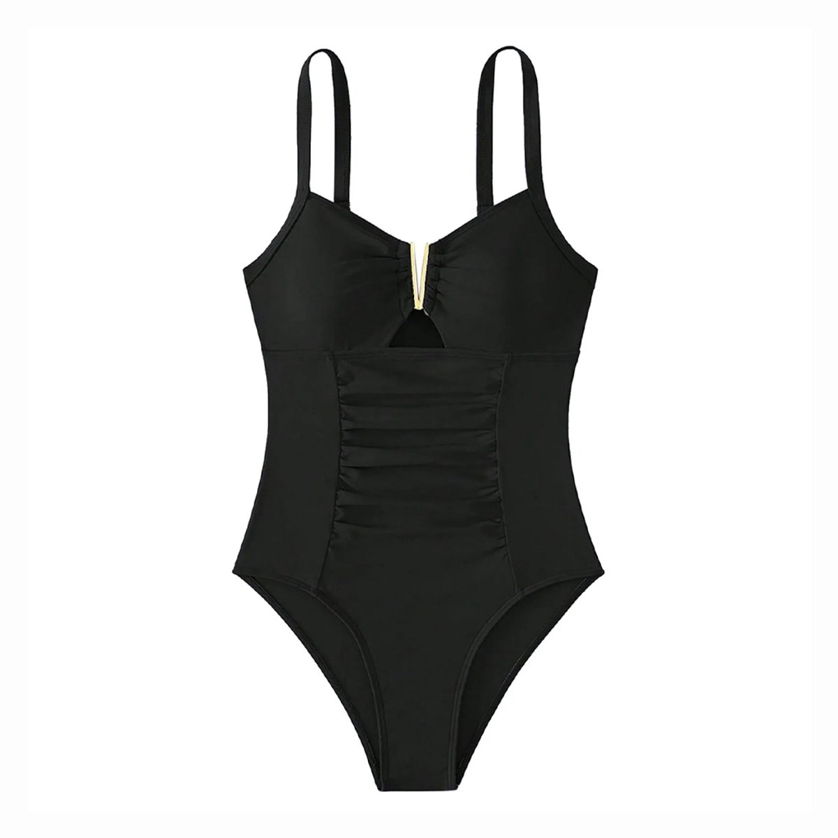 Dit stijlvolle zwarte badpak combineert klasse met comfort. De subtiele plooien en het gouden V-detail geven een luxe uitstraling. Het buikgedeelte heeft een corrigerend effect voor een flatterend silhouet. Verstelbare bandjes zorgen voor optimale ondersteuning. Perfect voor een chique stranddag of relaxte spa-ervaring.