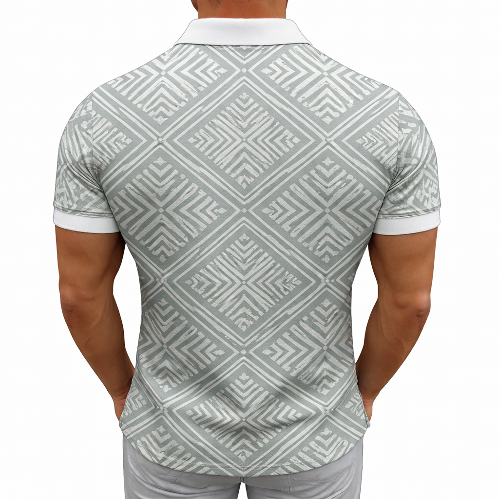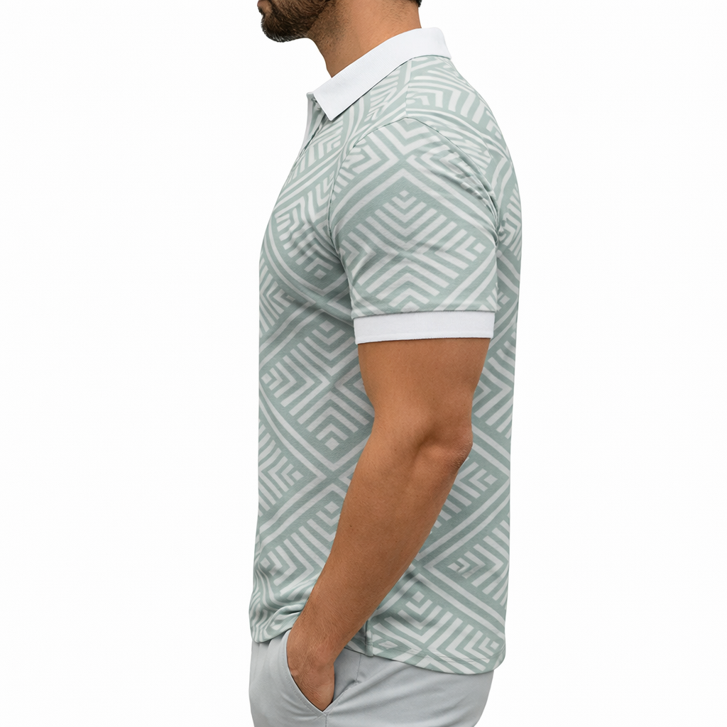 Dit stijlvolle poloshirt voor heren is uitgevoerd in een frisse lichtgroene kleur met een wit geometrisch patroon dat zorgt voor een moderne look. De slanke pasvorm accentueert het lichaam zonder in te boeten op comfort. De witte kraag met korte rits en bijpassende witte mouwranden geven het shirt een strak en verzorgd accent. Gemaakt van een soepele en ademende stof, ideaal voor warmere dagen. Combineer het met een lichte broek of short voor een zomerse en modieuze outfit.