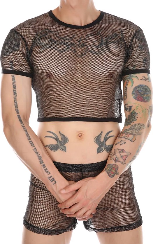 Deze sexy outfit is perfect voor mannen die een gewaagde look willen dragen voor speciale gelegenheden, clubwear of als spannende lingerie. De set bestaat uit een transparant shirt en een bijpassende short, beide ontworpen om het lichaam te accentueren en de aandacht te trekken. De stof voelt comfortabel aan en biedt een sensuele uitstraling, ideaal voor intieme momenten of stijlvolle clubavonden.