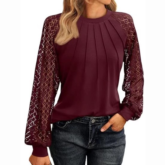 Deze stijlvolle damesblouse combineert comfort en elegantie in één ontwerp. De voorzijde is afgewerkt met subtiele plooien die een verfijnde uitstraling geven. De lange mouwen zijn gemaakt van transparant kant met een decoratief patroon, wat een vrouwelijke touch toevoegt. De ronde hals en rechte snit zorgen voor een flatterende pasvorm. Deze blouse is perfect voor zowel een dag op kantoor als een avondje uit. Combineer het eenvoudig met een jeans of rok voor een complete look.