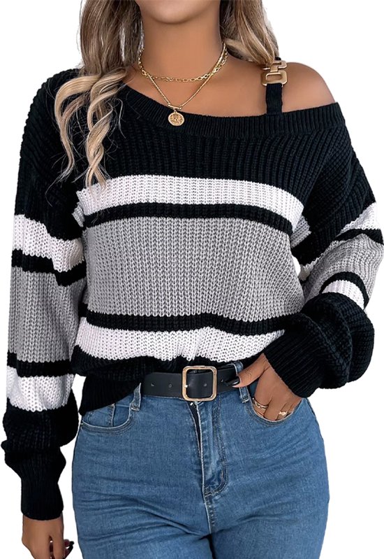 Deze trui is gemaakt van een grofgebreid materiaal dat warmte en comfort biedt. De afwisseling van zwarte, grijze en witte strepen geeft de trui een moderne uitstraling. De off-shoulder stijl met zichtbare schouderbandjes zorgt voor een speels en vrouwelijk accent. De losse pasvorm en geribde boorden aan mouwen en zoom dragen bij aan het nonchalante karakter. Ideaal te combineren met een jeans voor een stijlvolle, casual outfit.